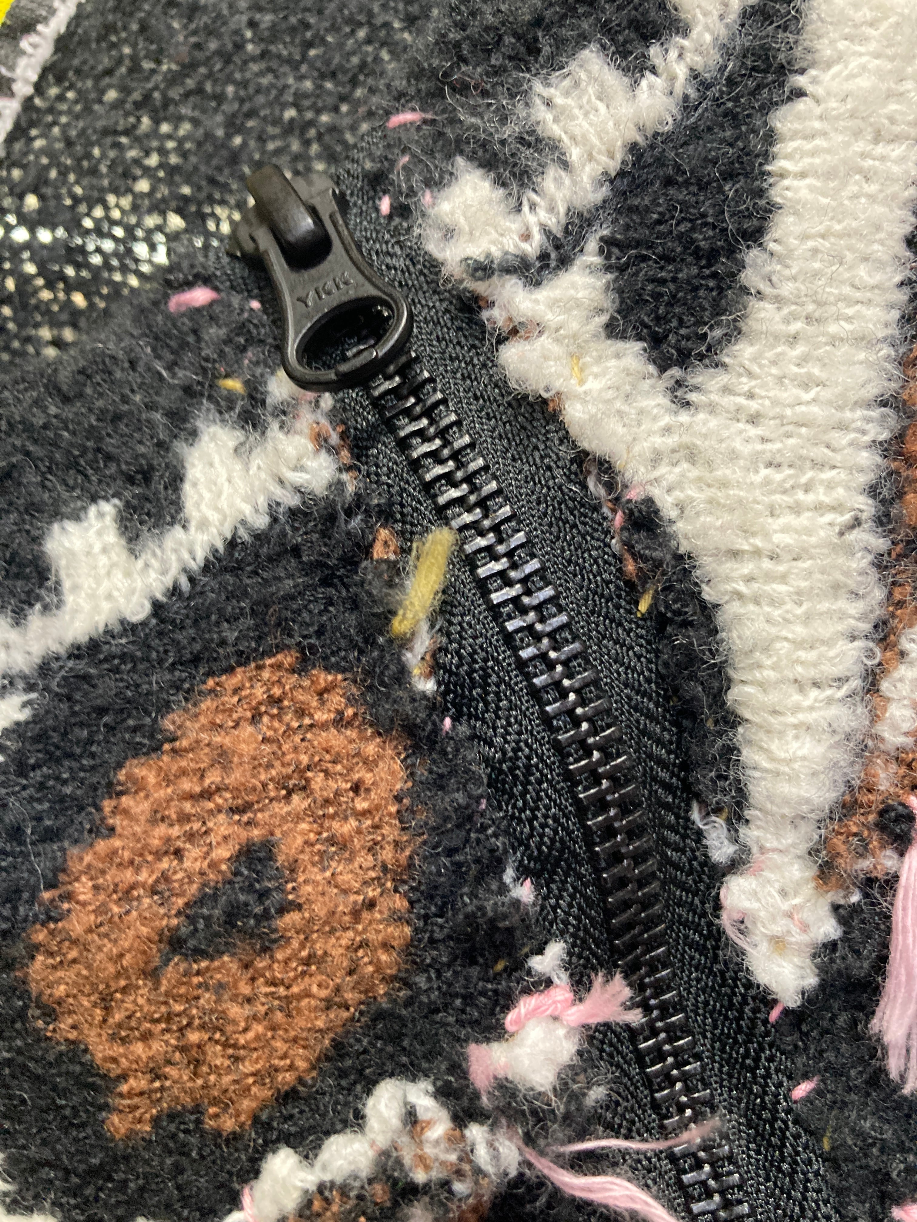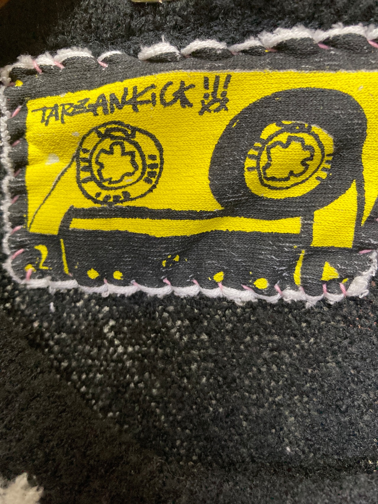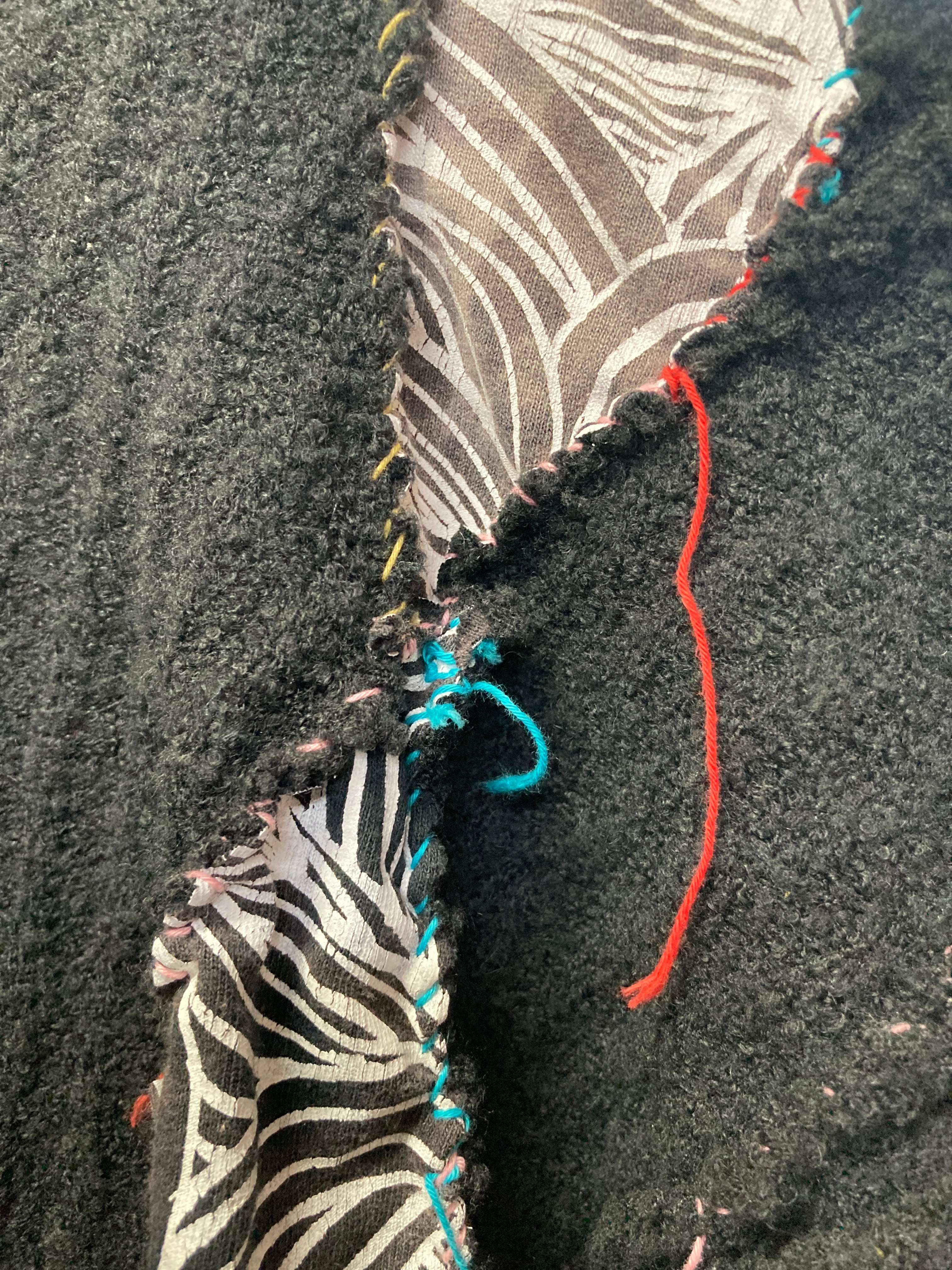 シルクスクリーンプリント生地も合間に混ぜられた手縫い渾身アイテム