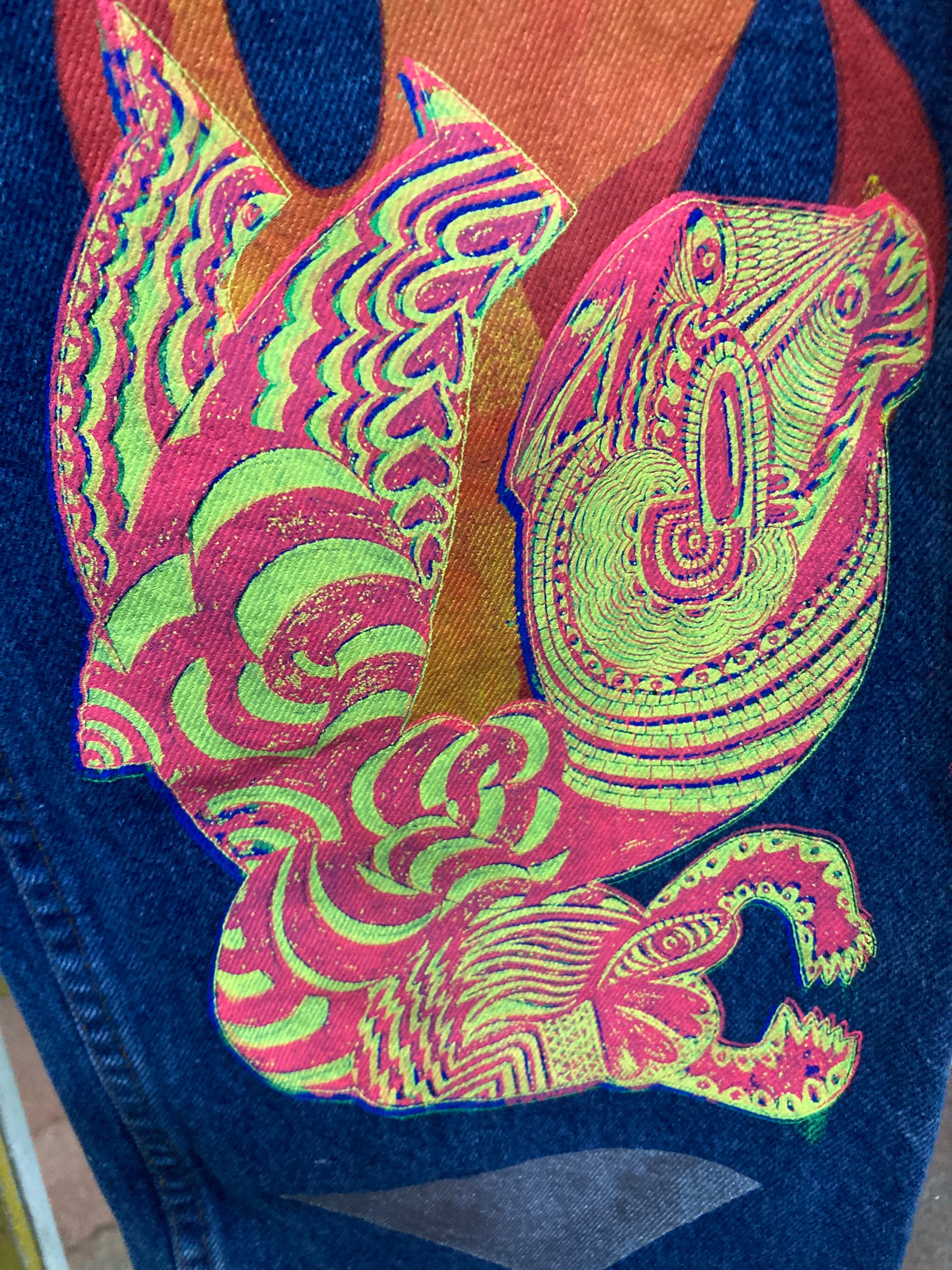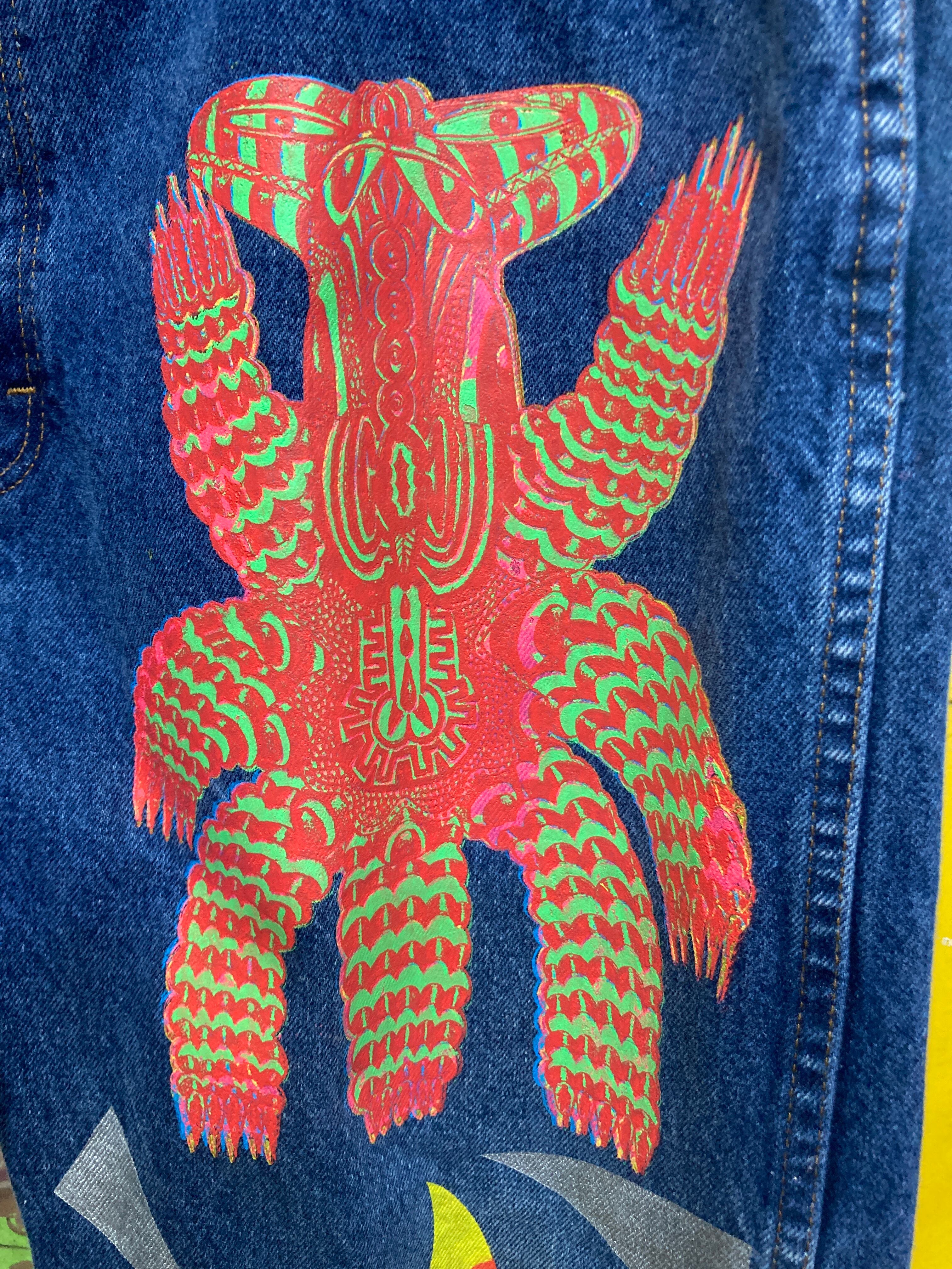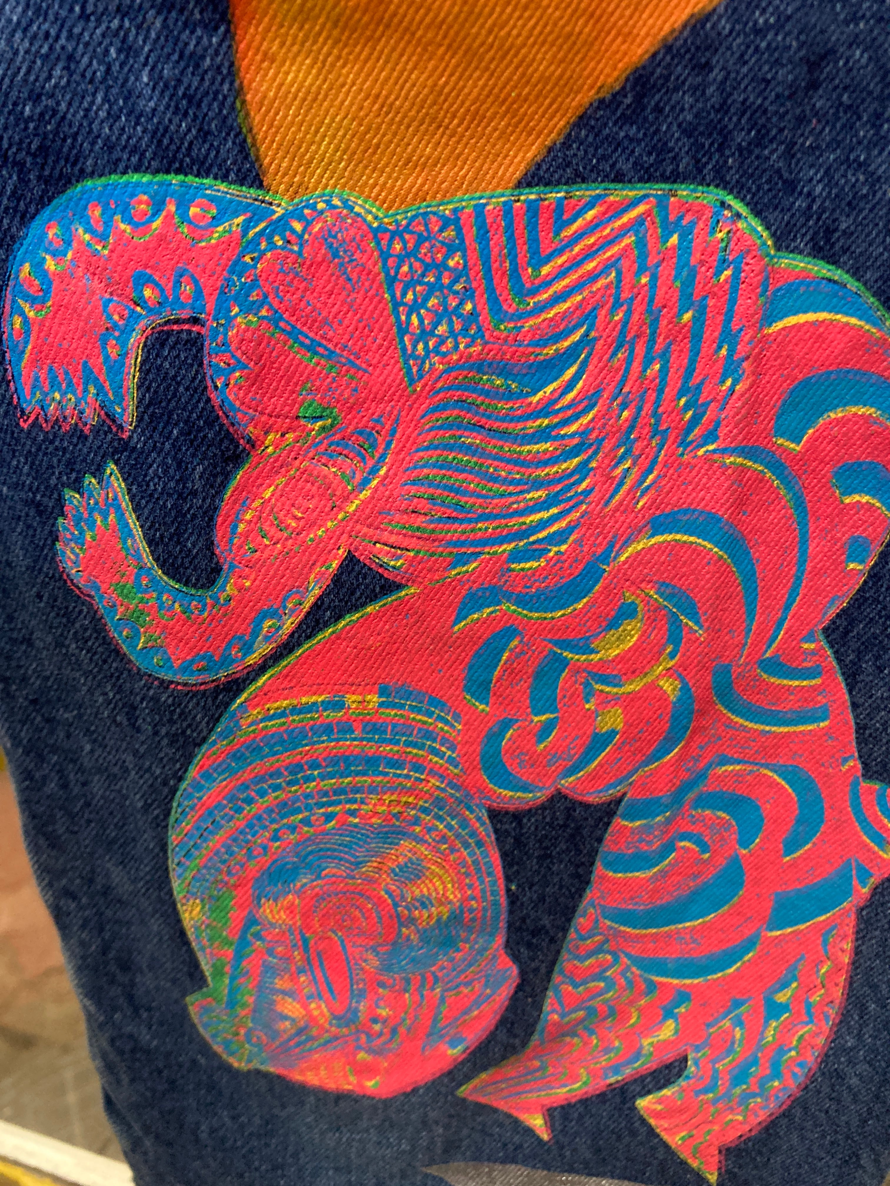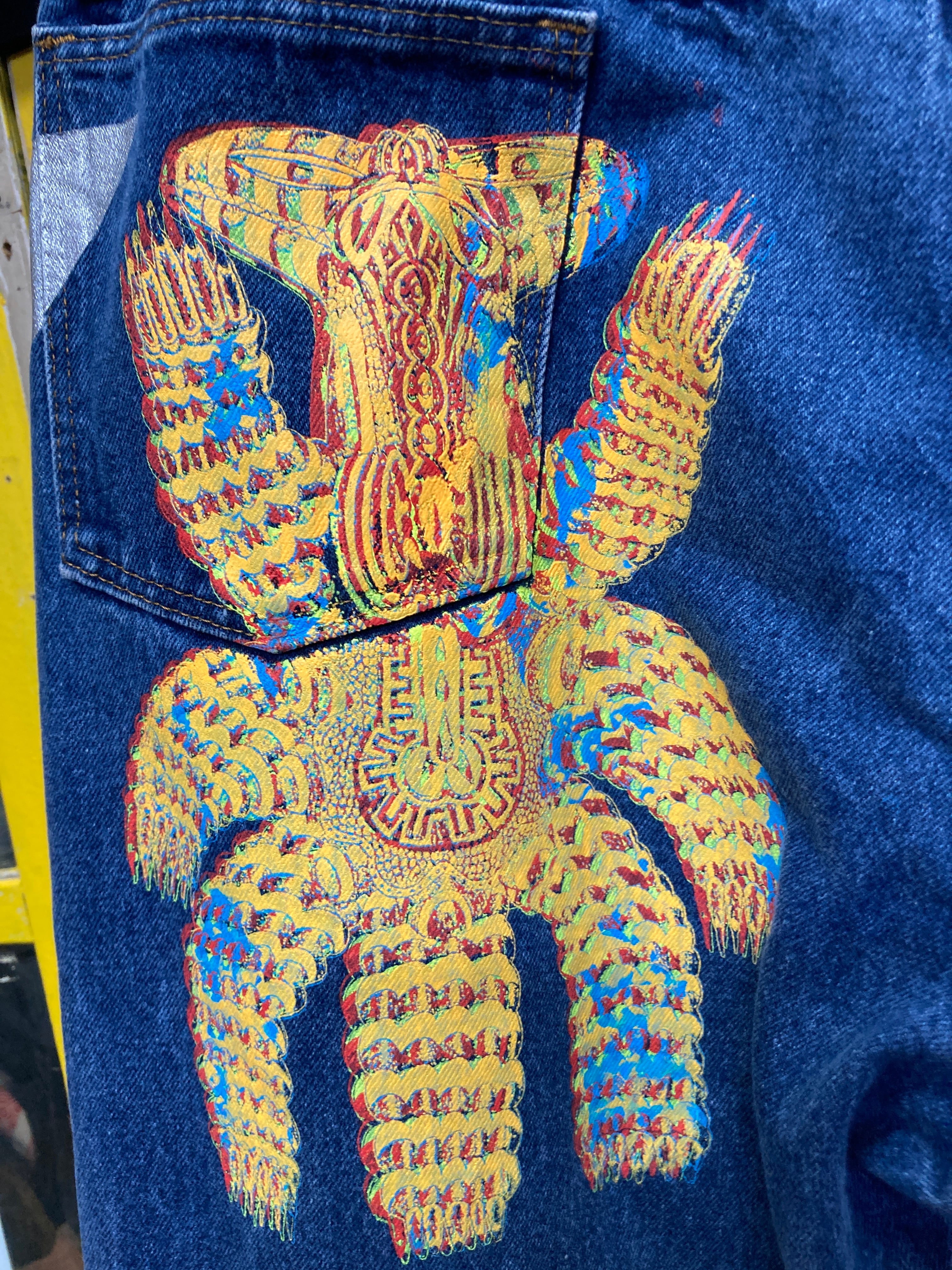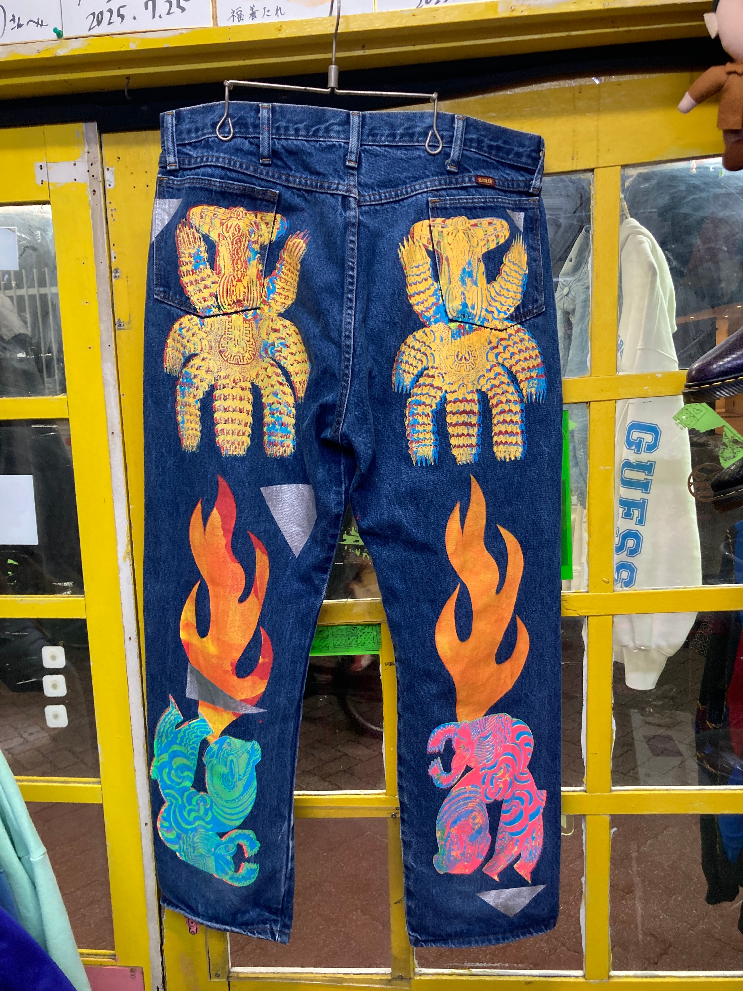 ベタ塗り手刷りシルクスクリーンの色重なりが豪華なプリントデニムパンツ