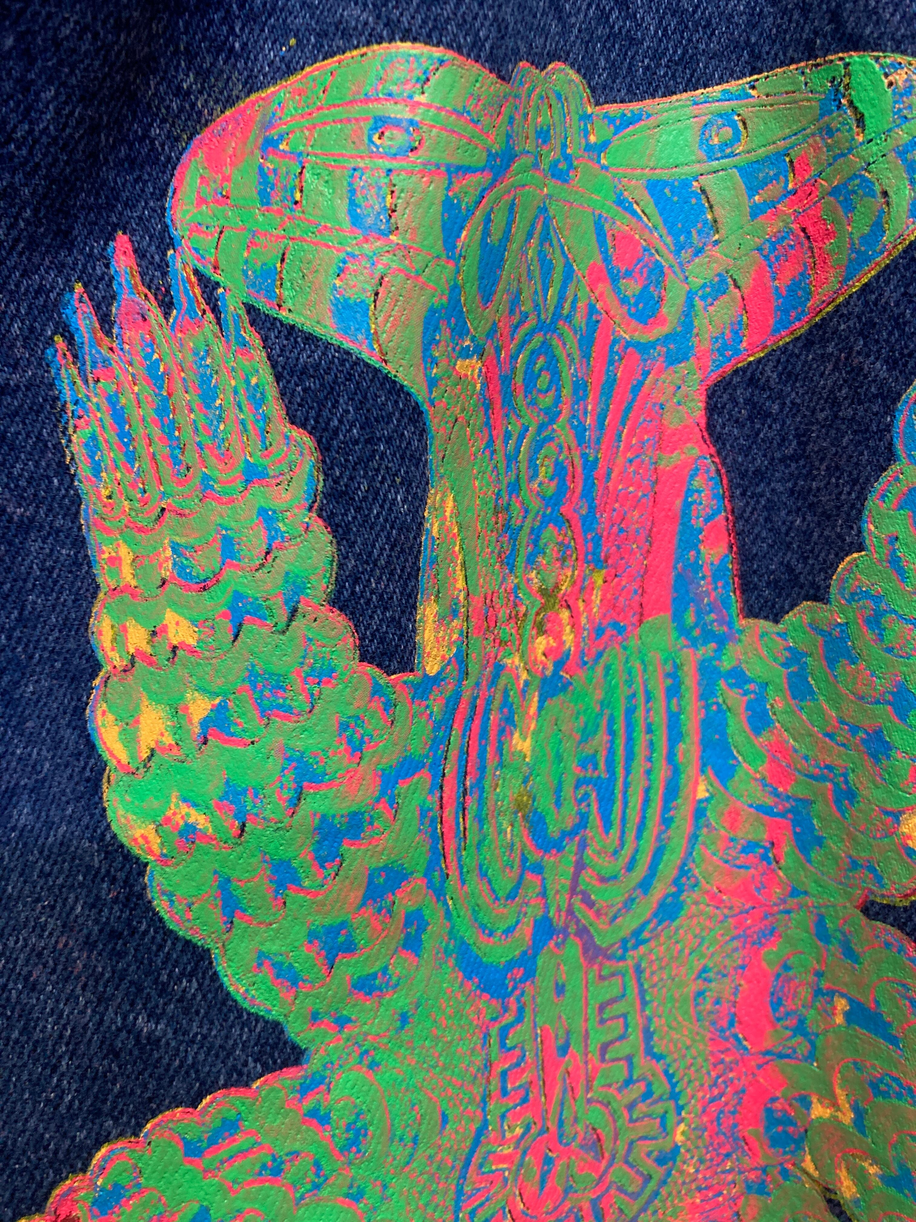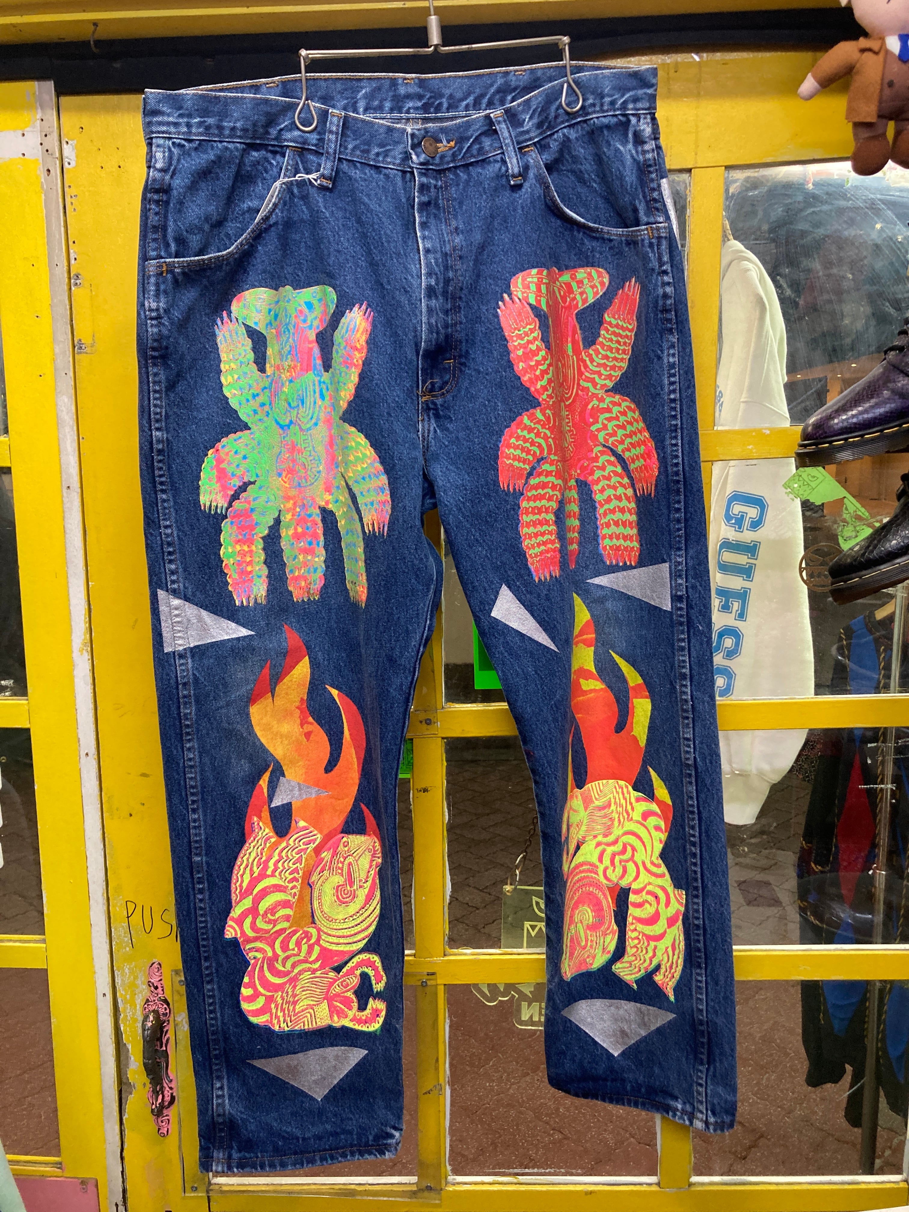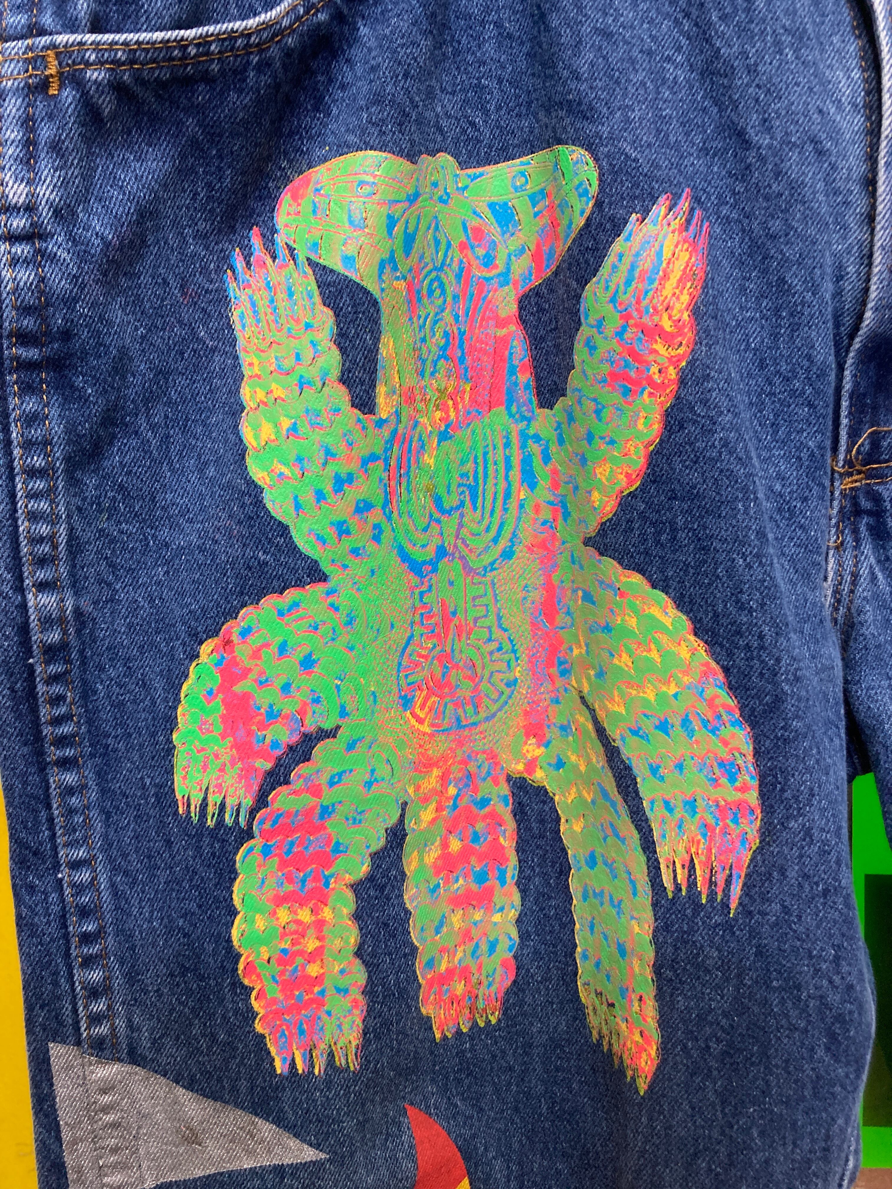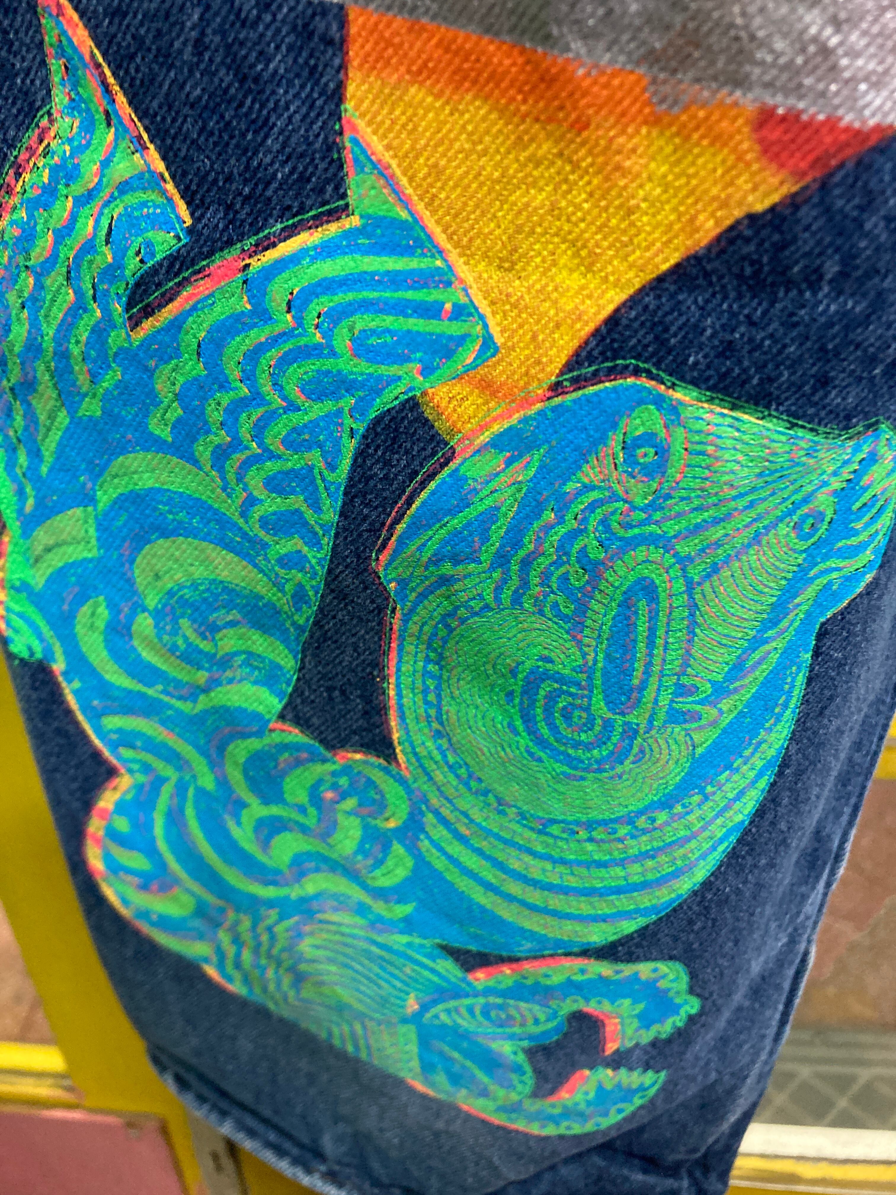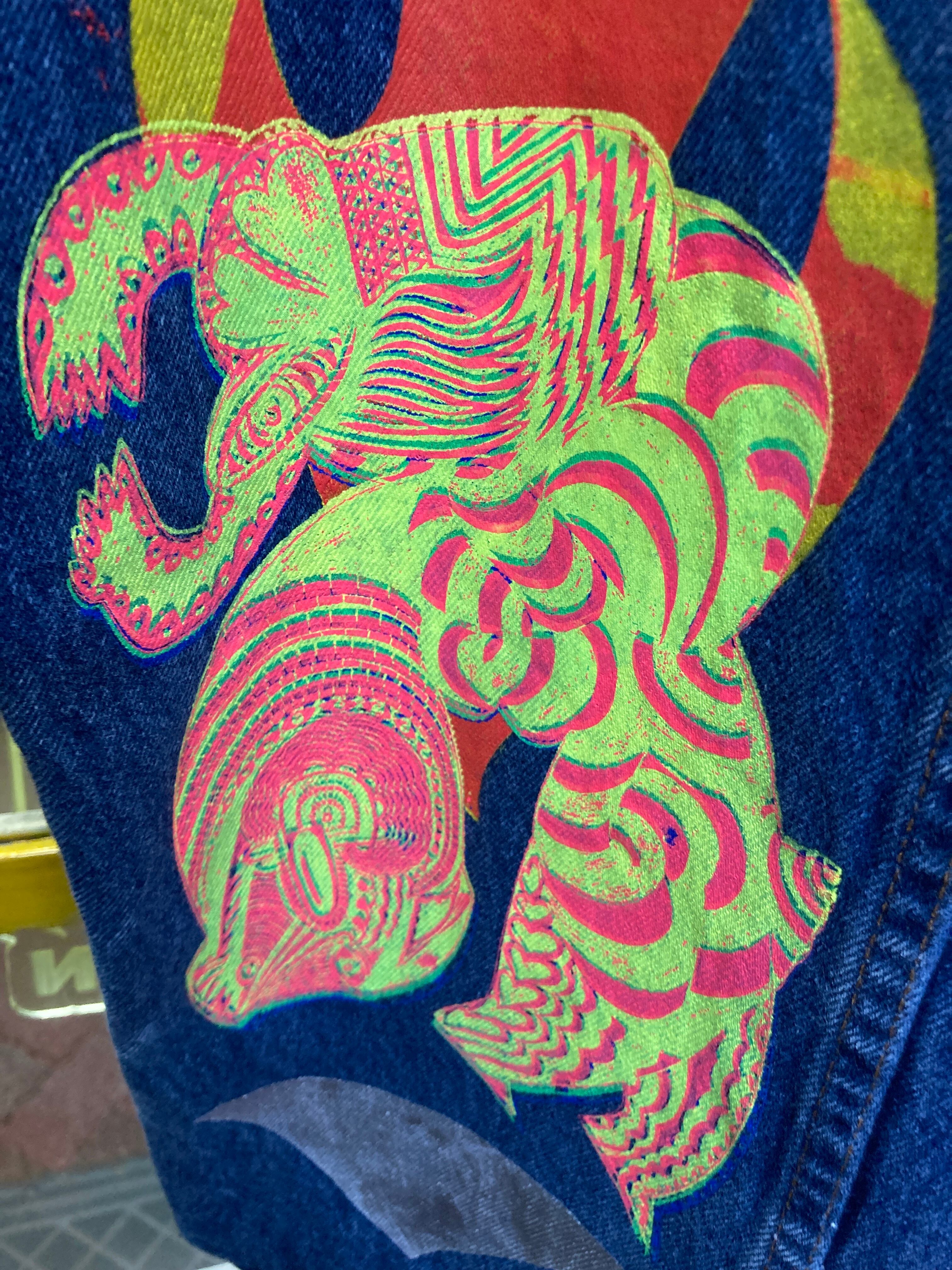 ベタ塗り手刷りシルクスクリーンの色重なりが豪華なプリントデニムパンツ