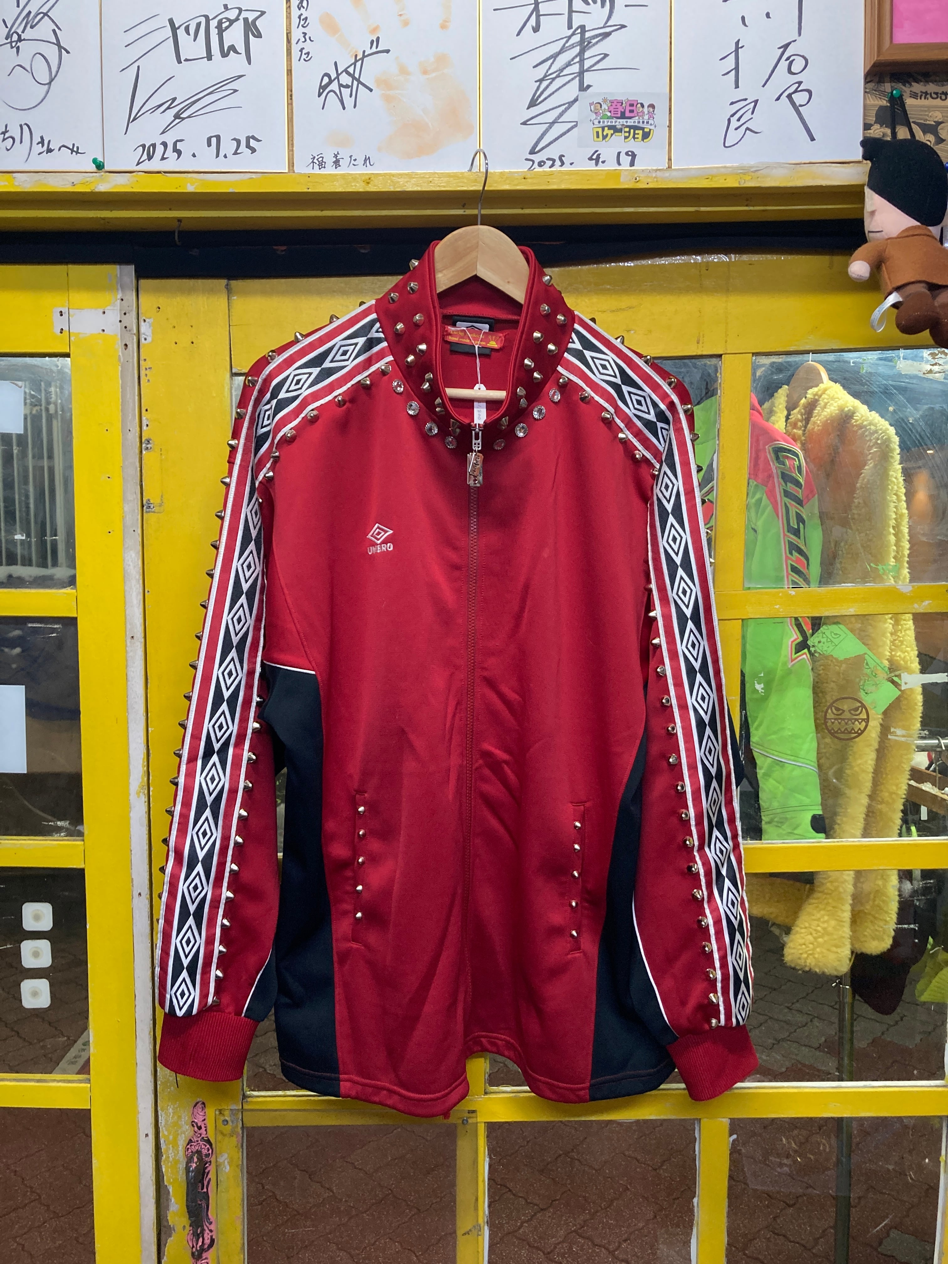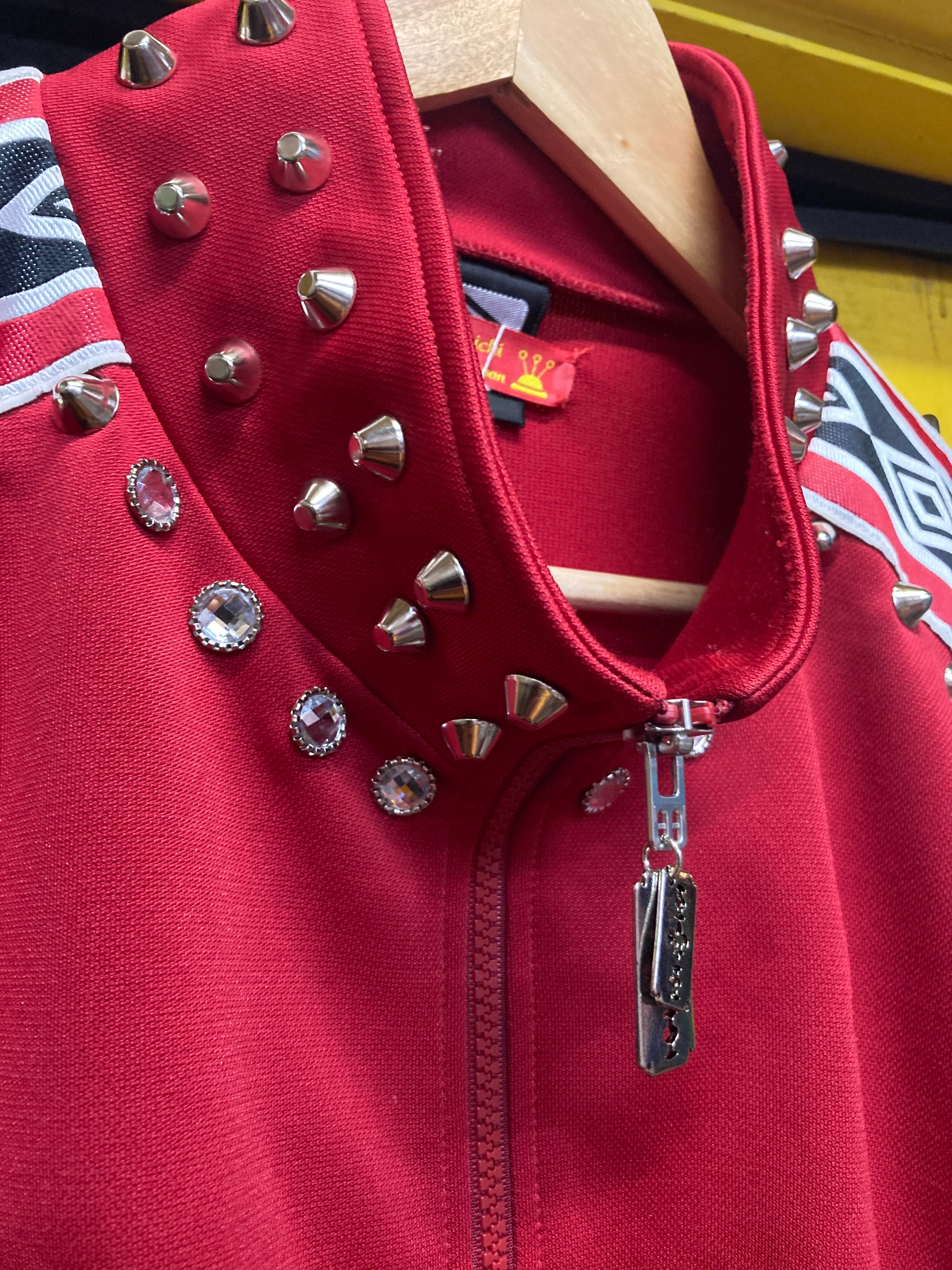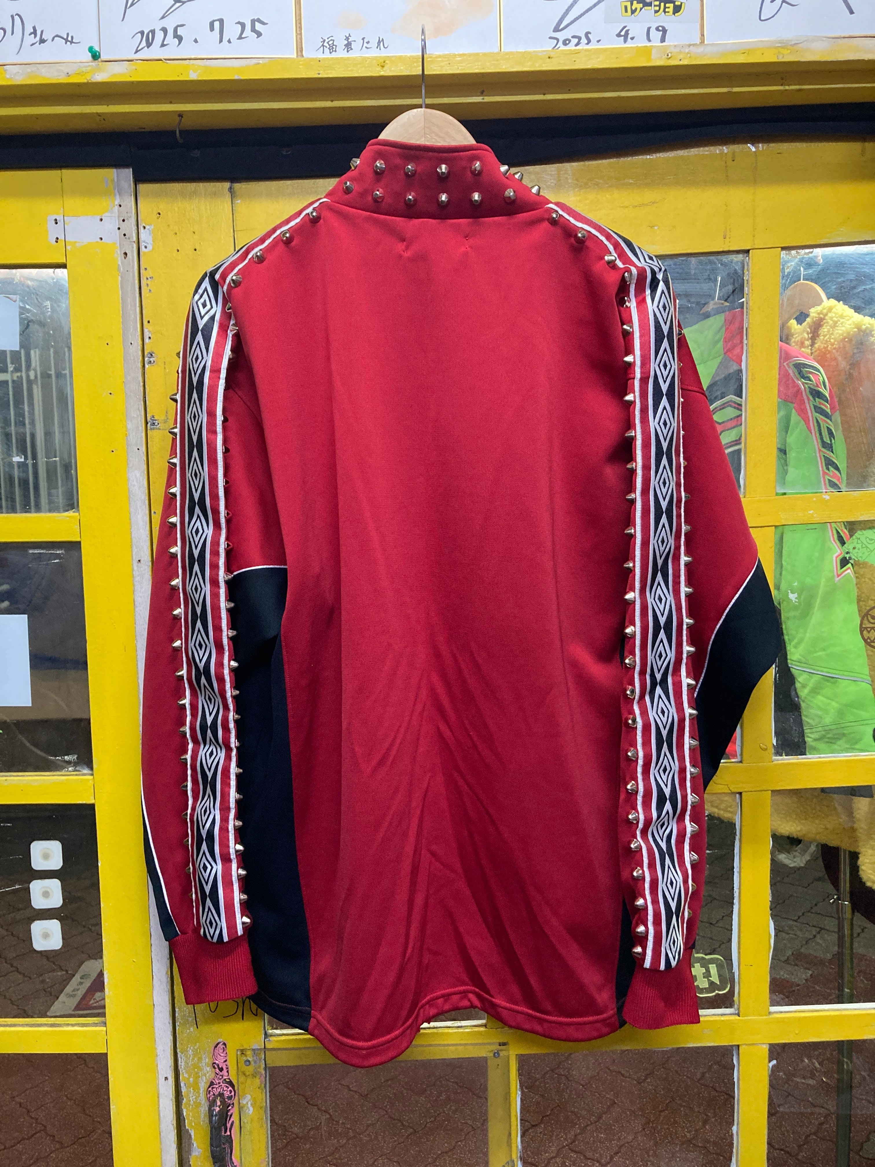 ビッグサイズの赤ジャージのスタッズカスタムがカッコいい鋲トラックジャケット