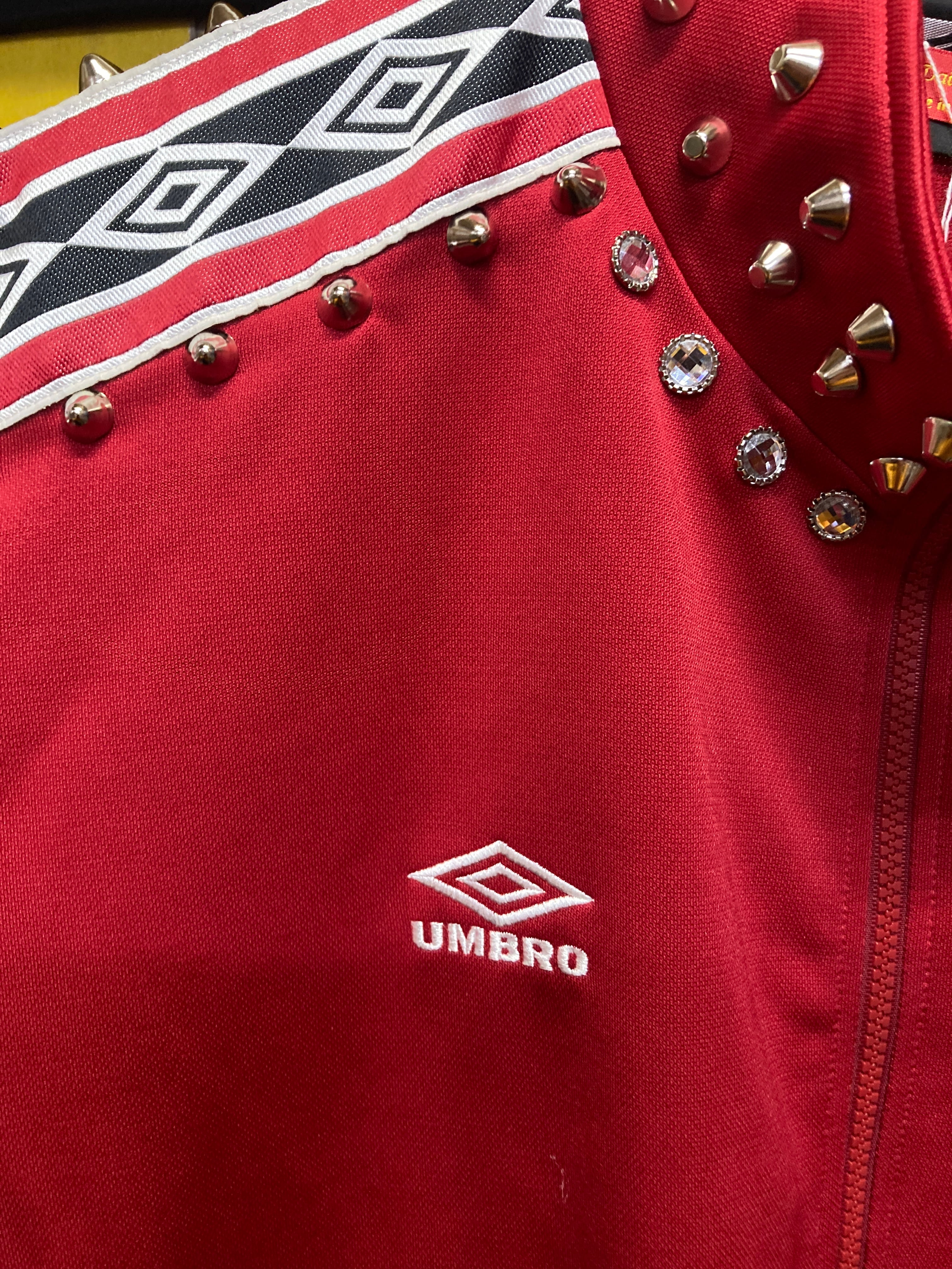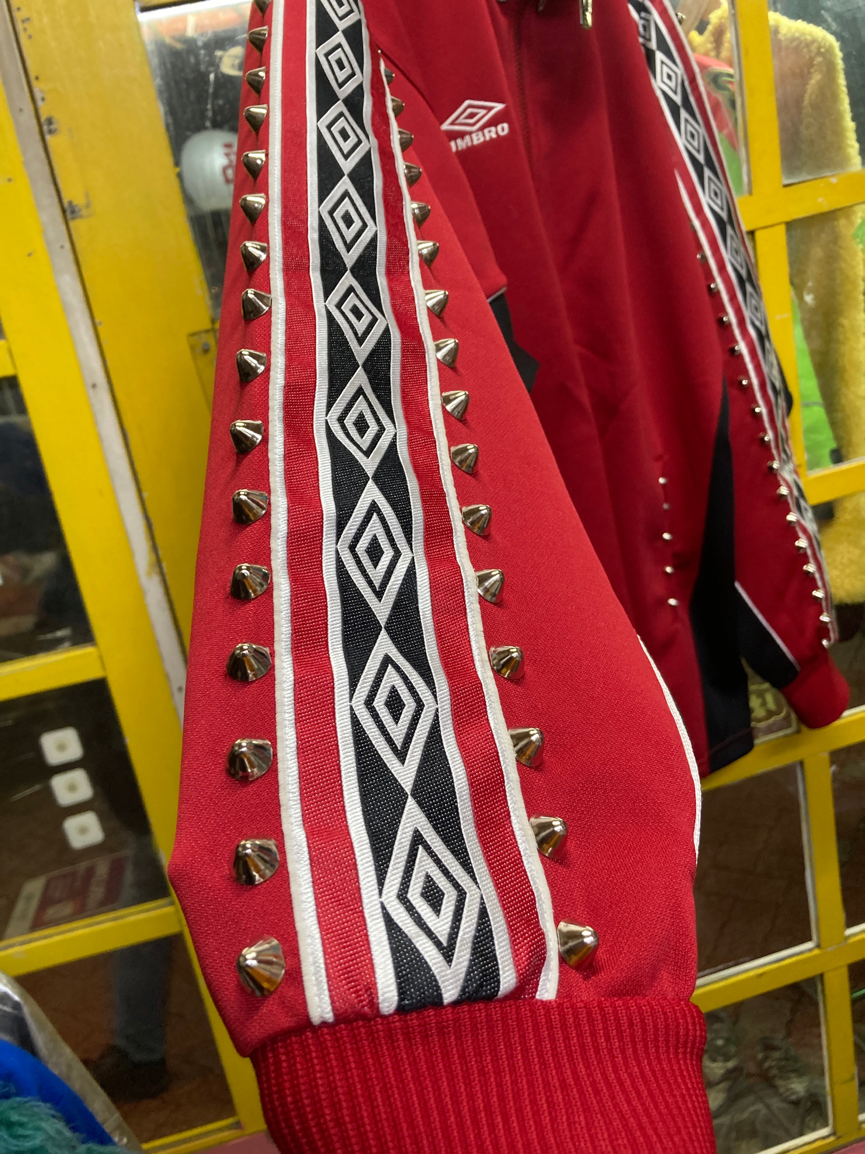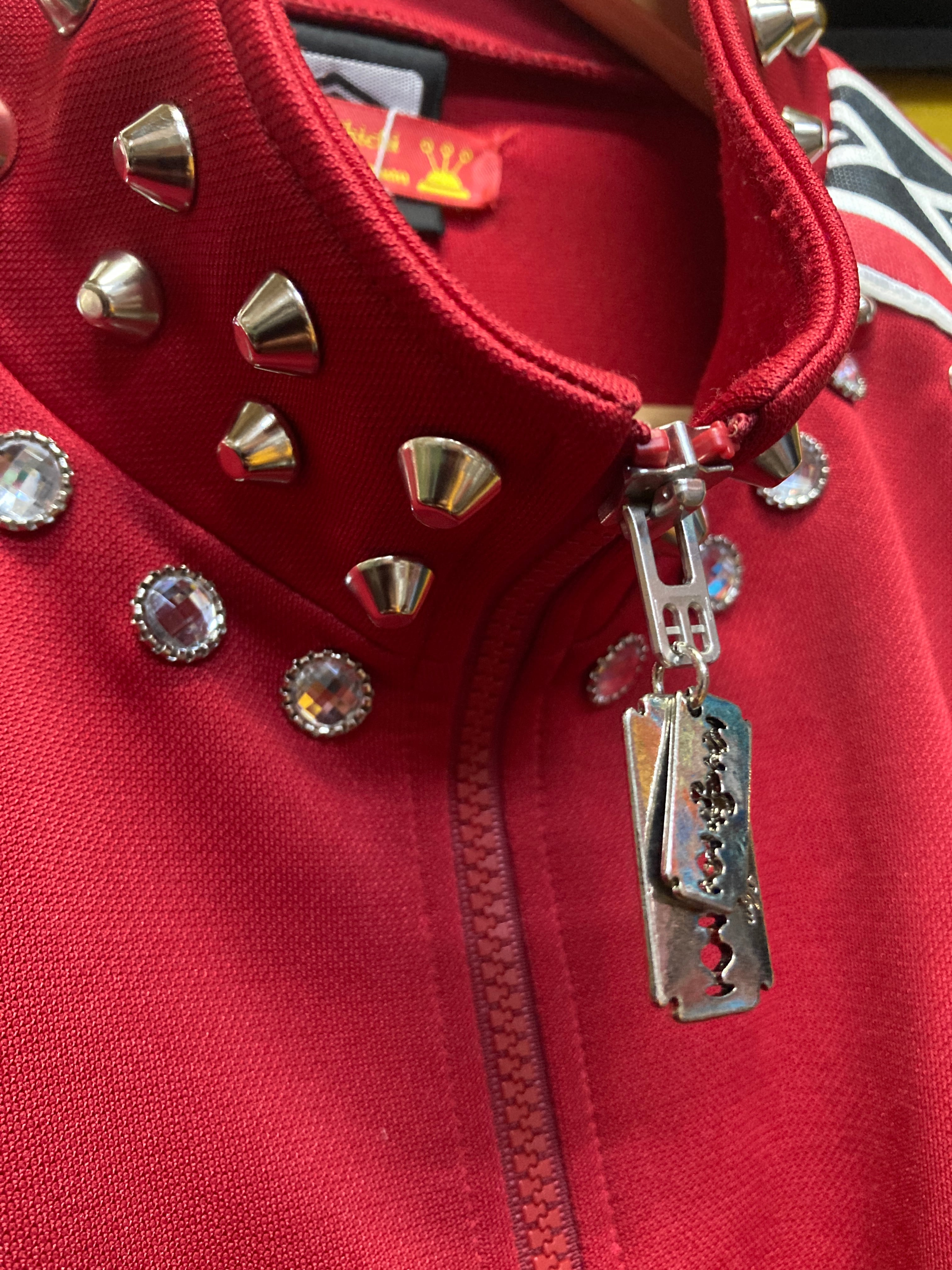 ビッグサイズの赤ジャージのスタッズカスタムがカッコいい鋲トラックジャケット