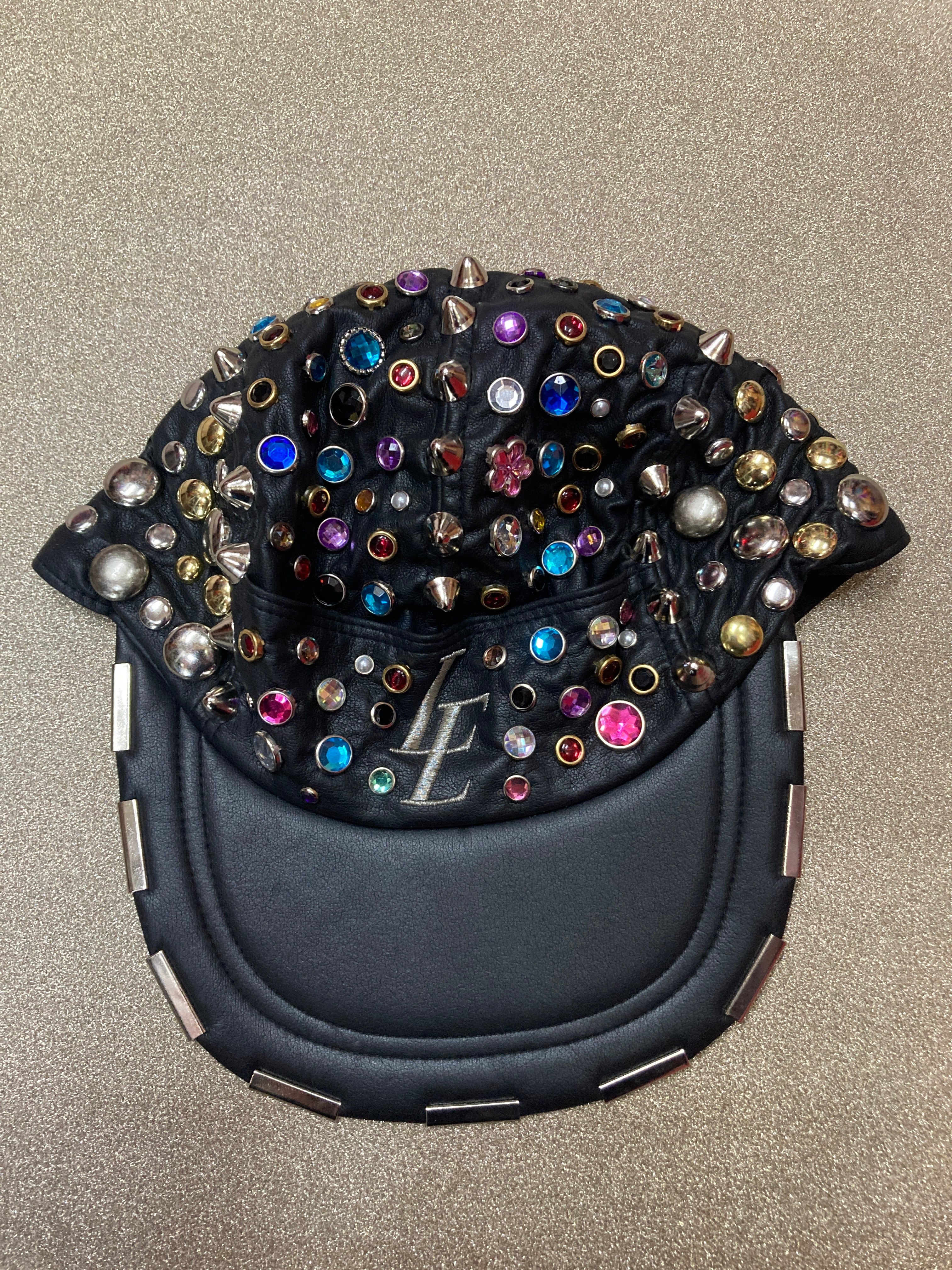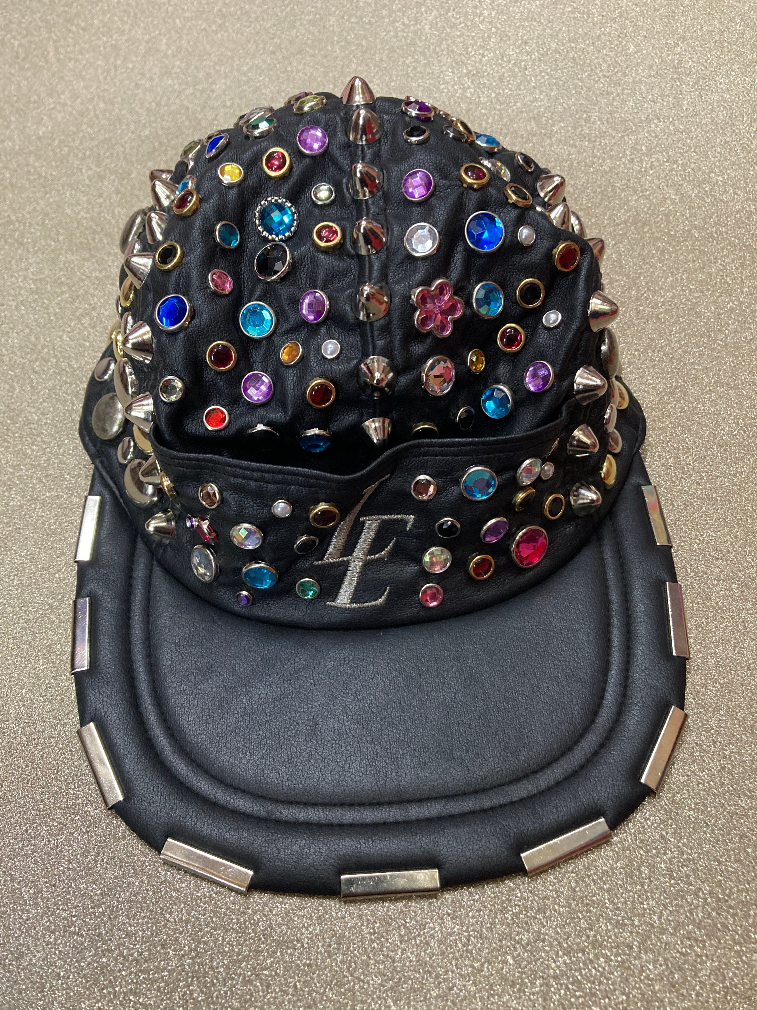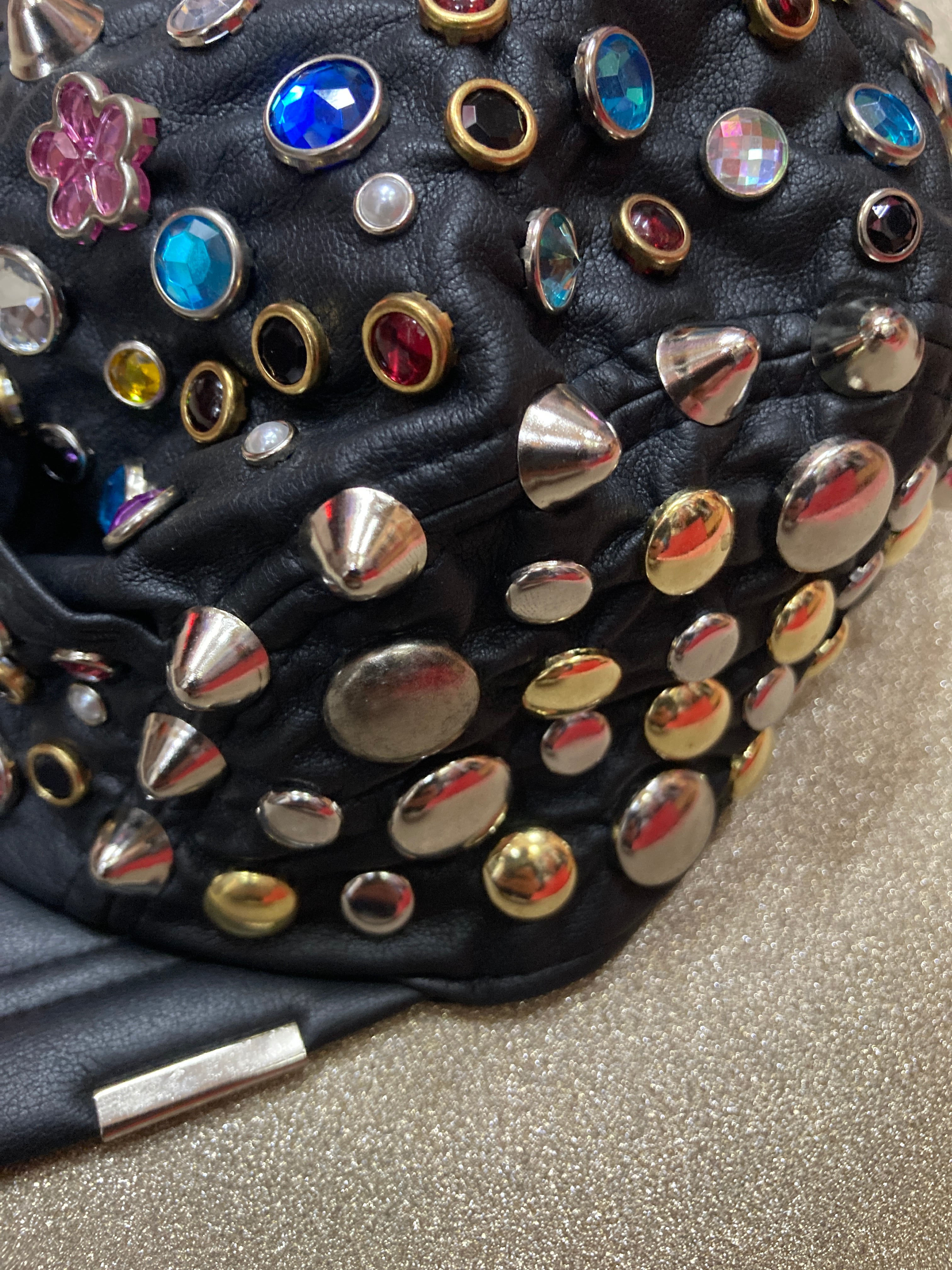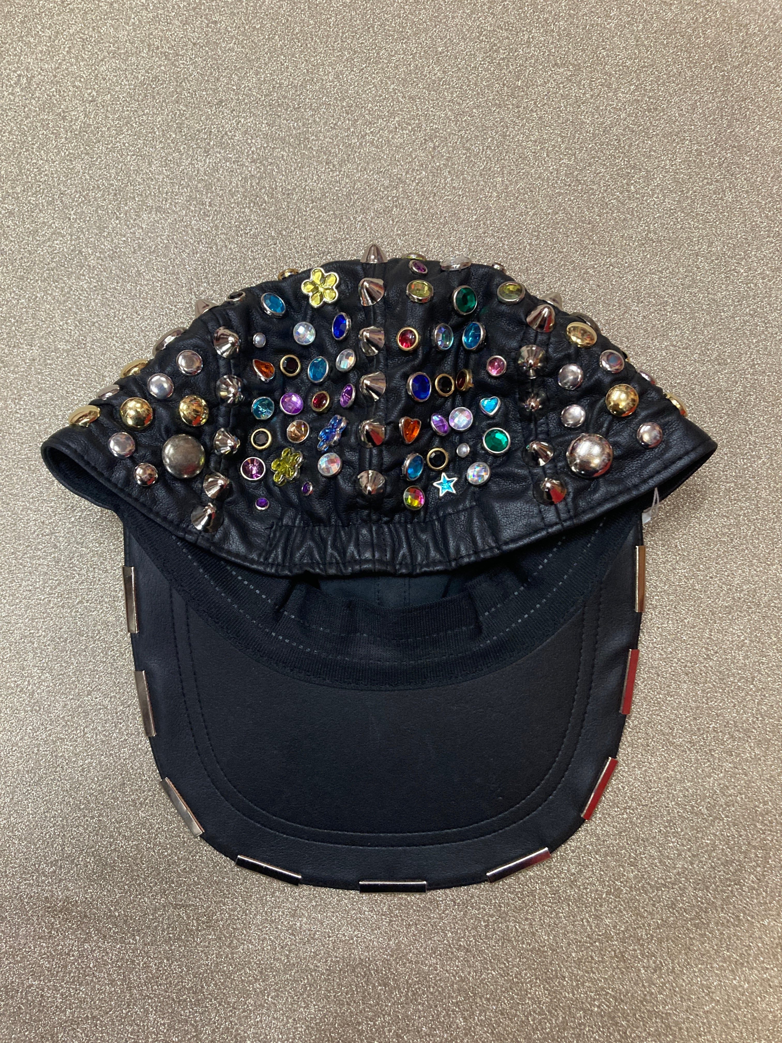 フェイクレザーキャップにゴージャスなジュエリーストーン大量に装飾された帽子