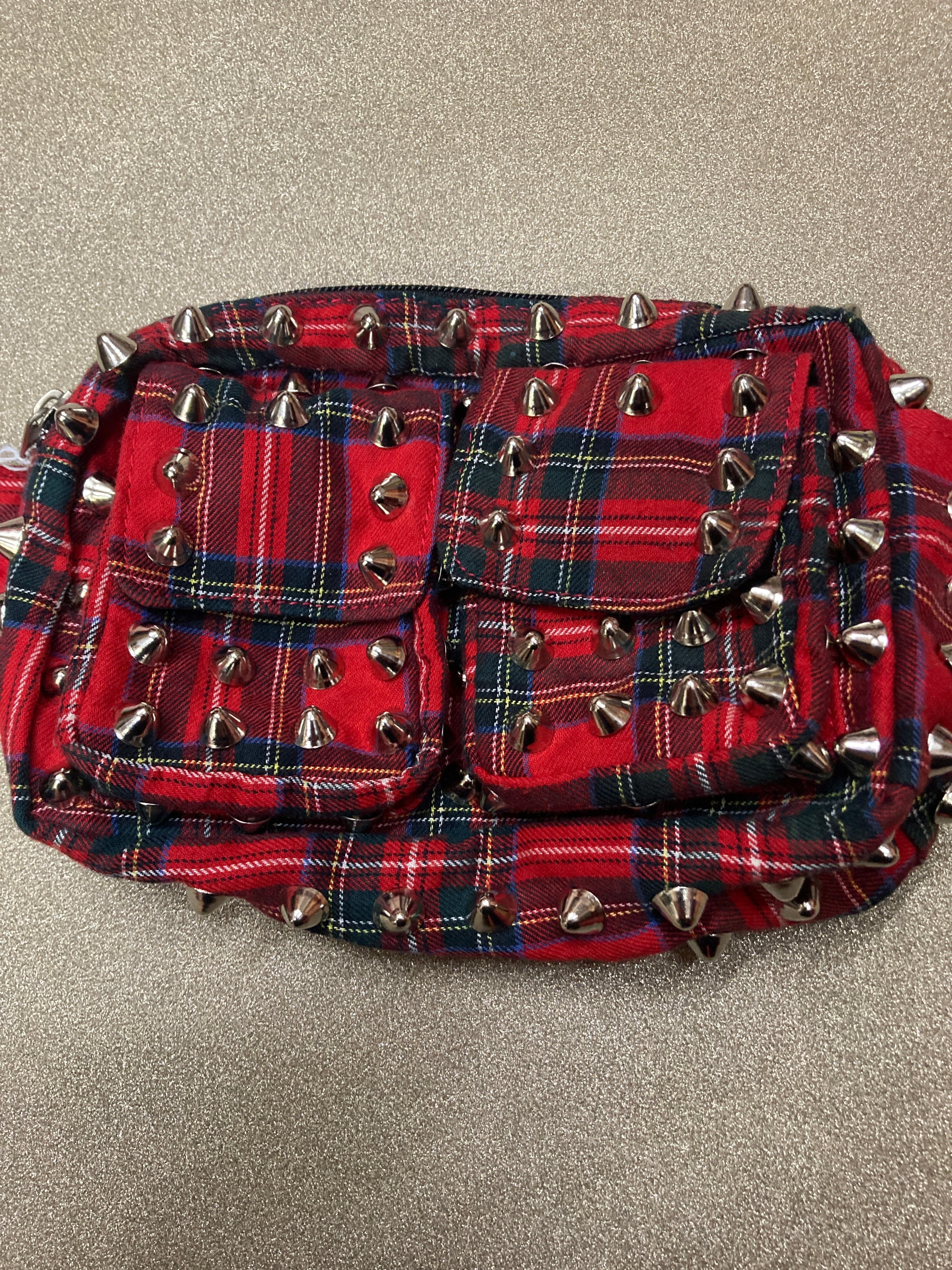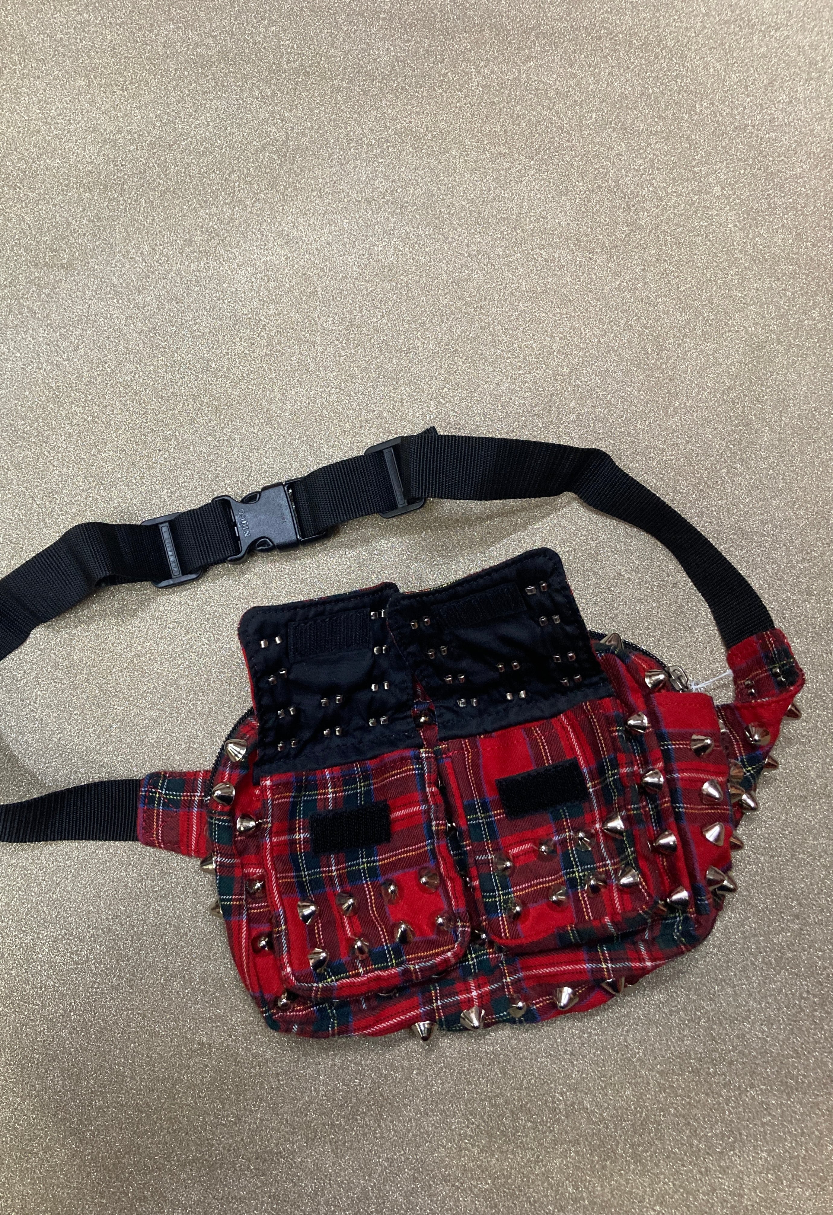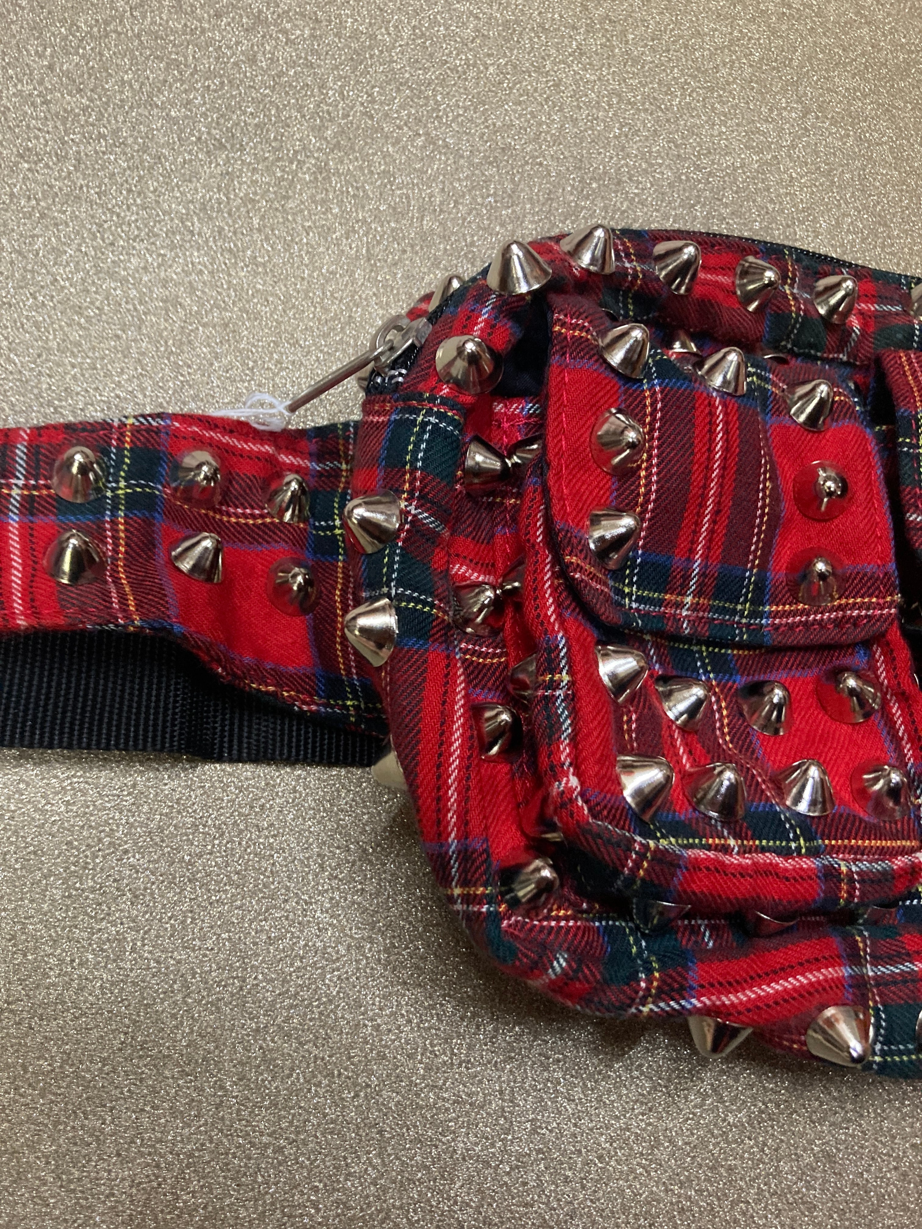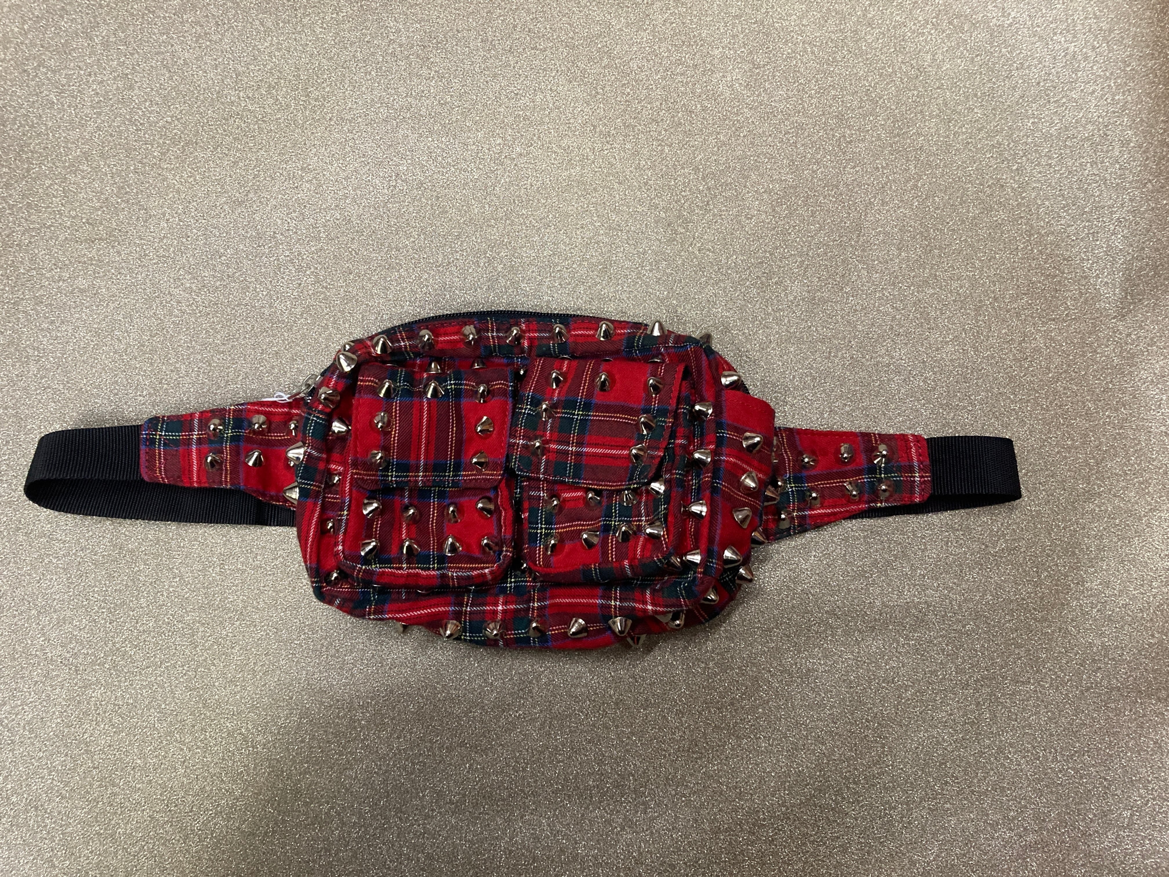 赤タータンチェック&スタッズの相性100点のカスタムがかわいい鋲ウエストポーチ