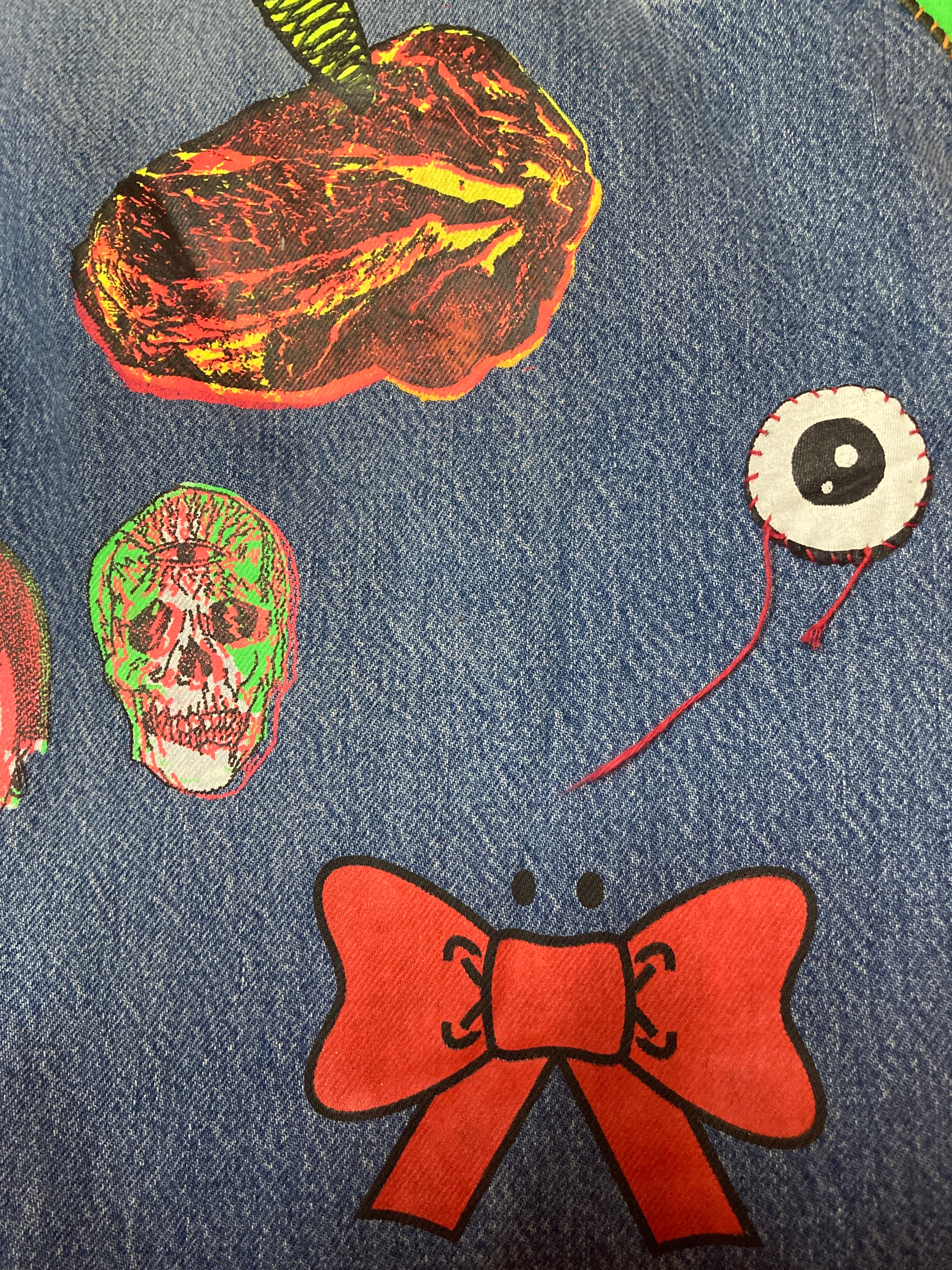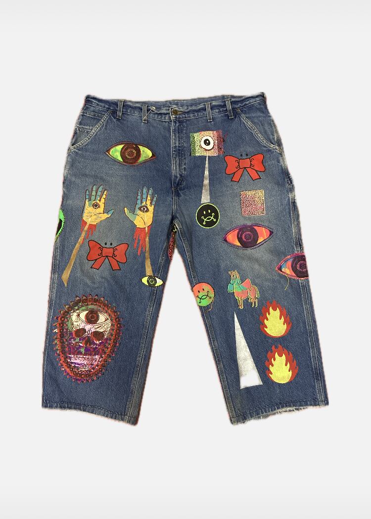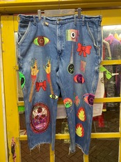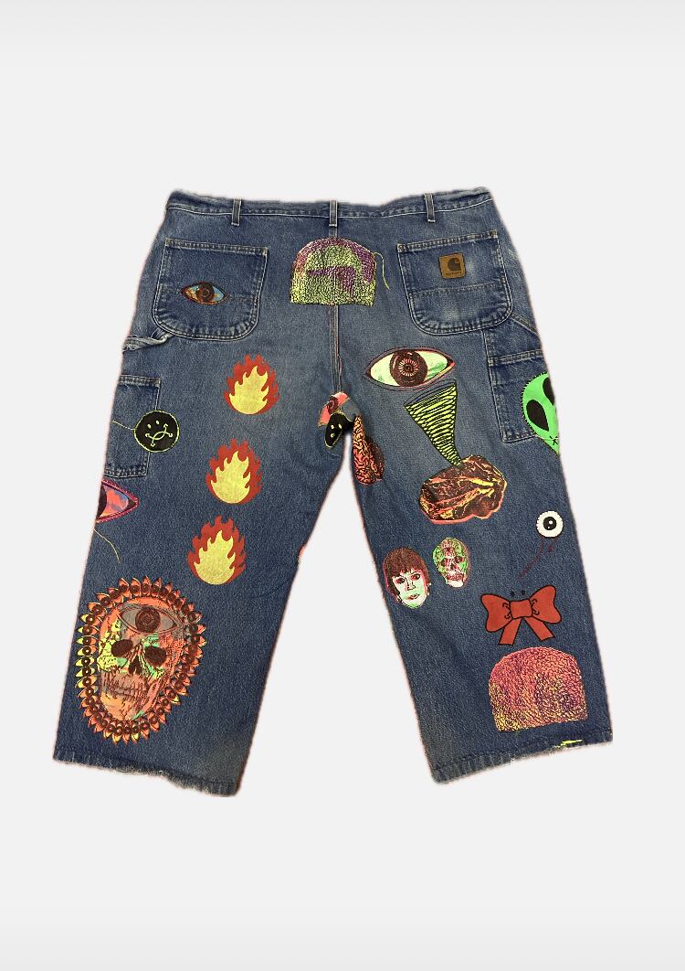 ビッグサイズペインターパンツにシルクスクリーンパッチ、手縫いパッチ、ワンモチーフにも何重にも重なったプリントがカッコいい手の込んだアイテム