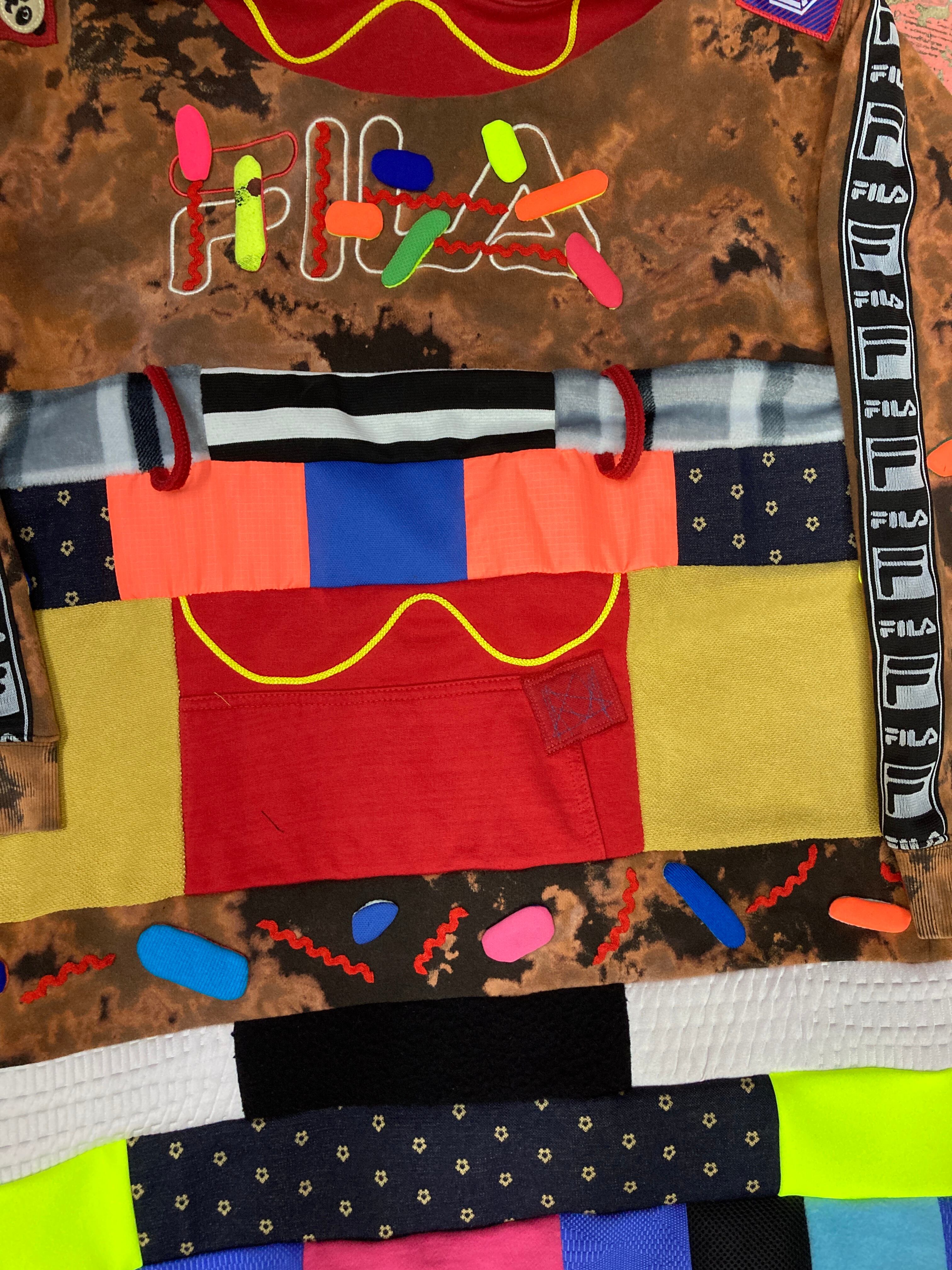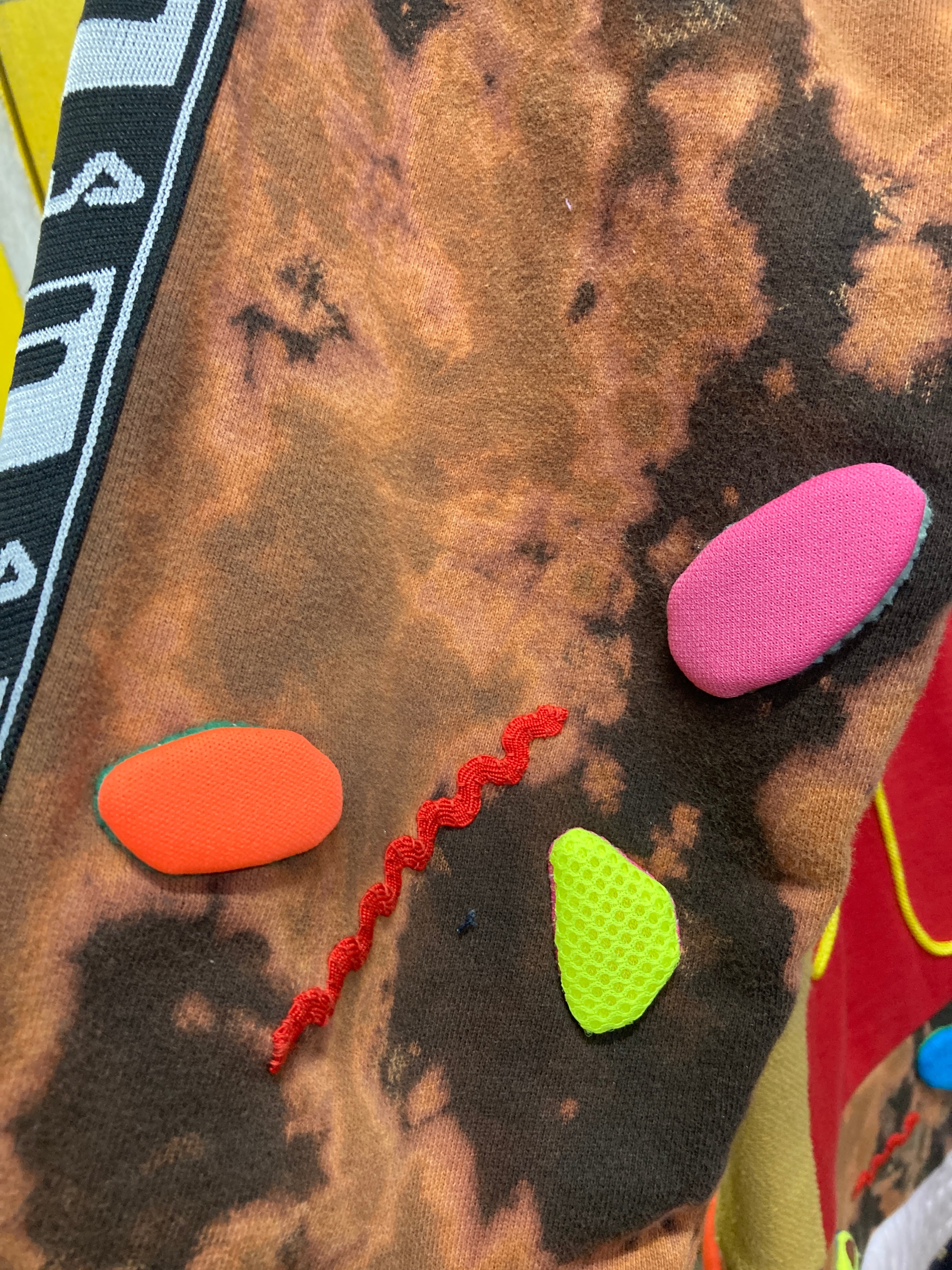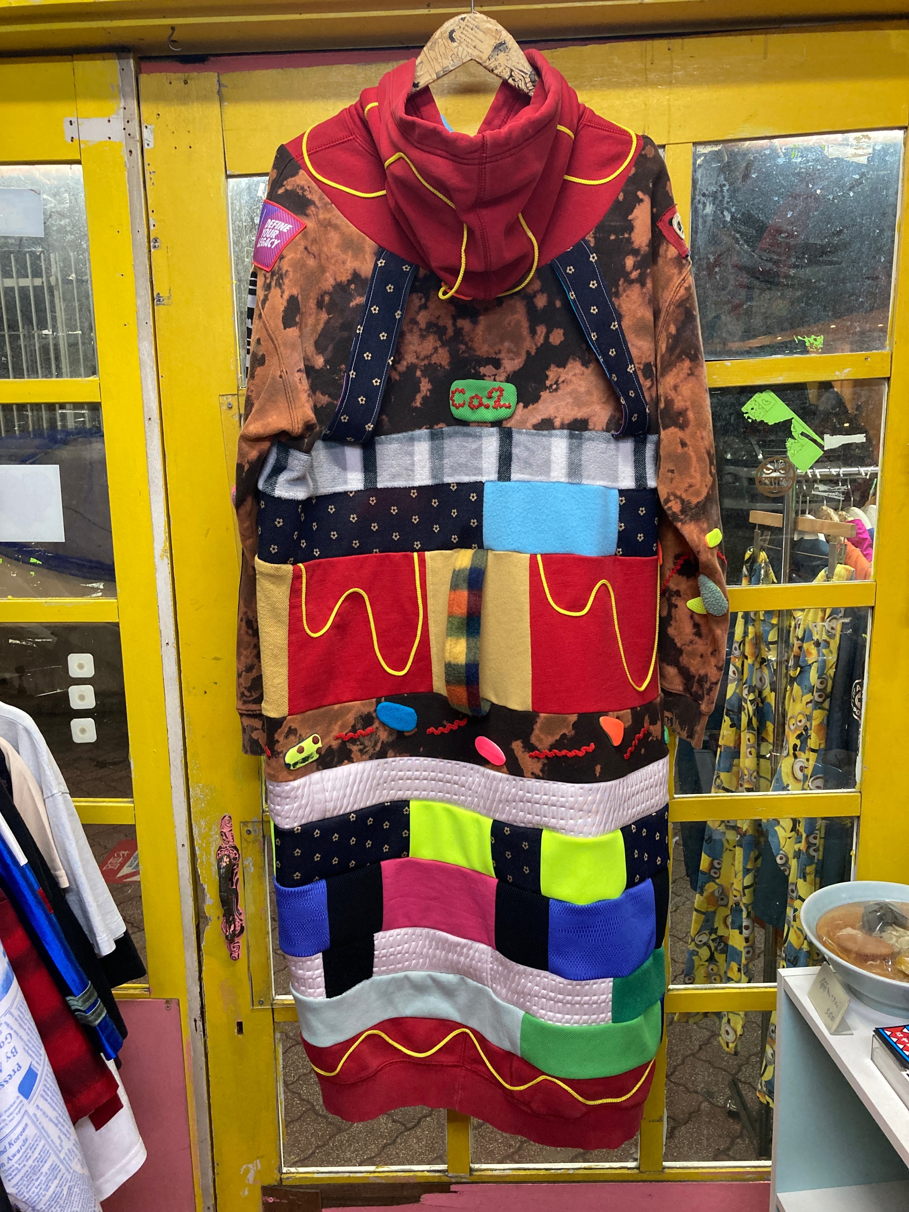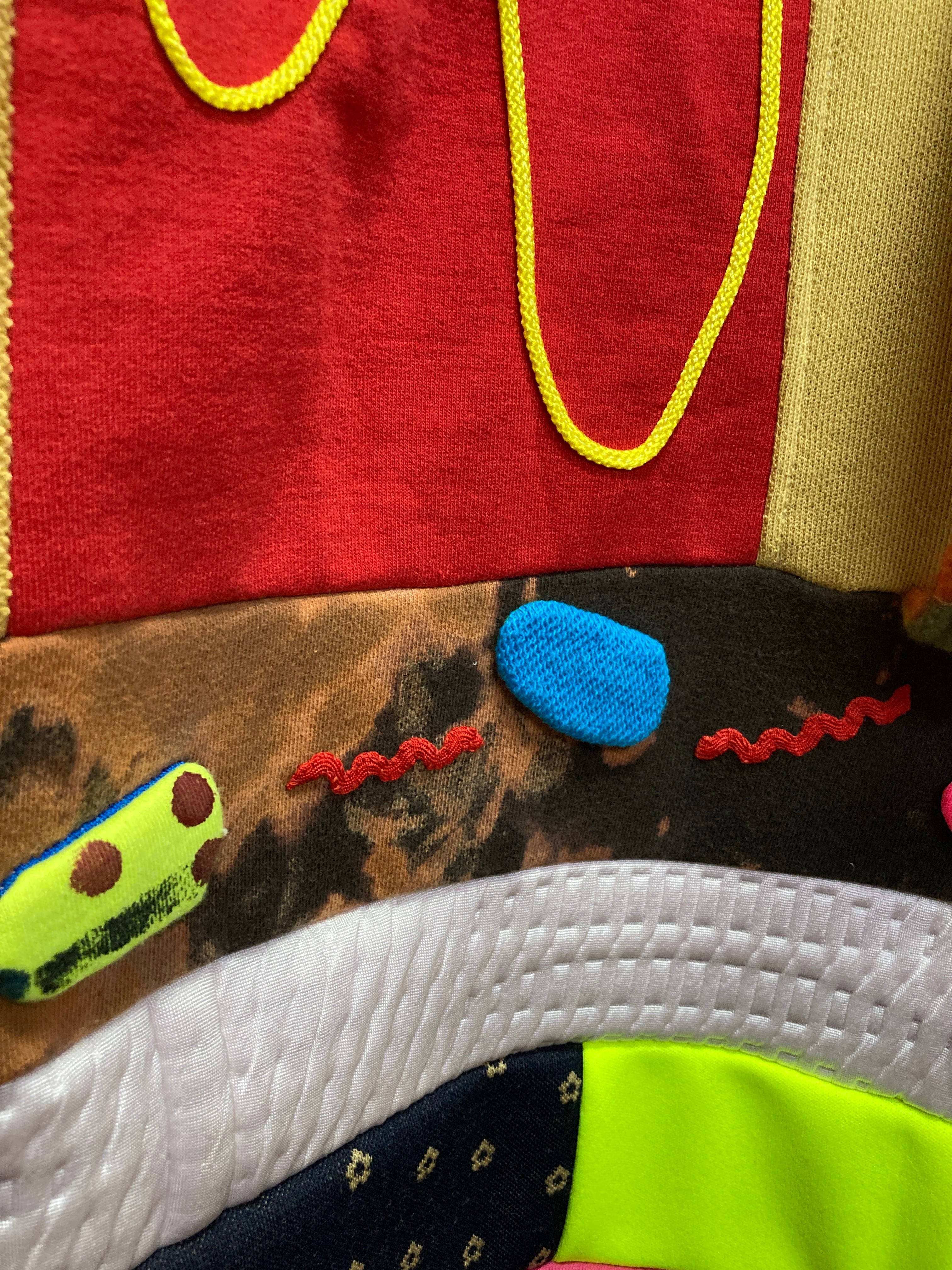 地層を表現したパッチワークとカラフルな砂利モチーフが立体的で可愛いスウェットマキシ丈ワンピース