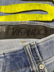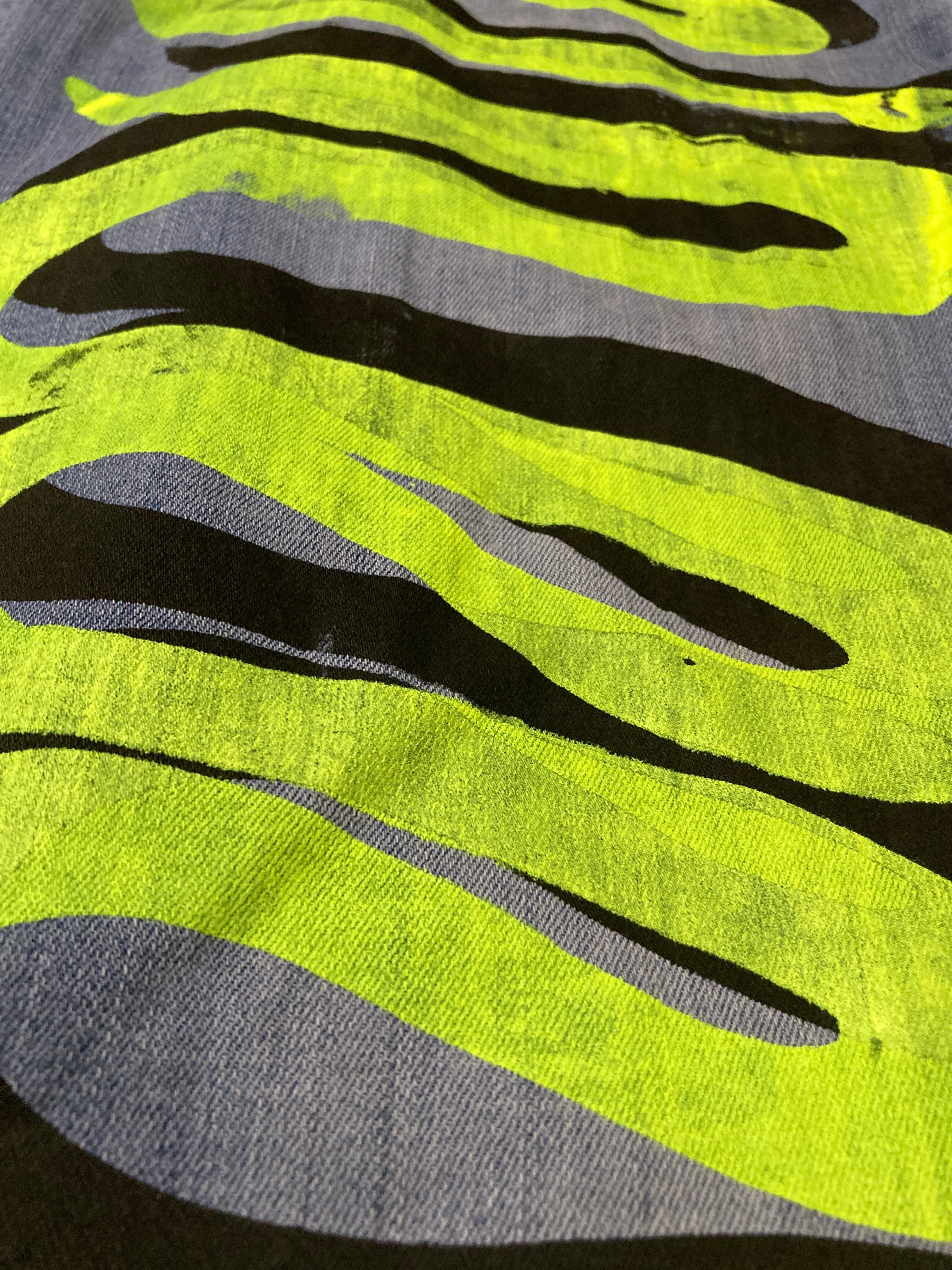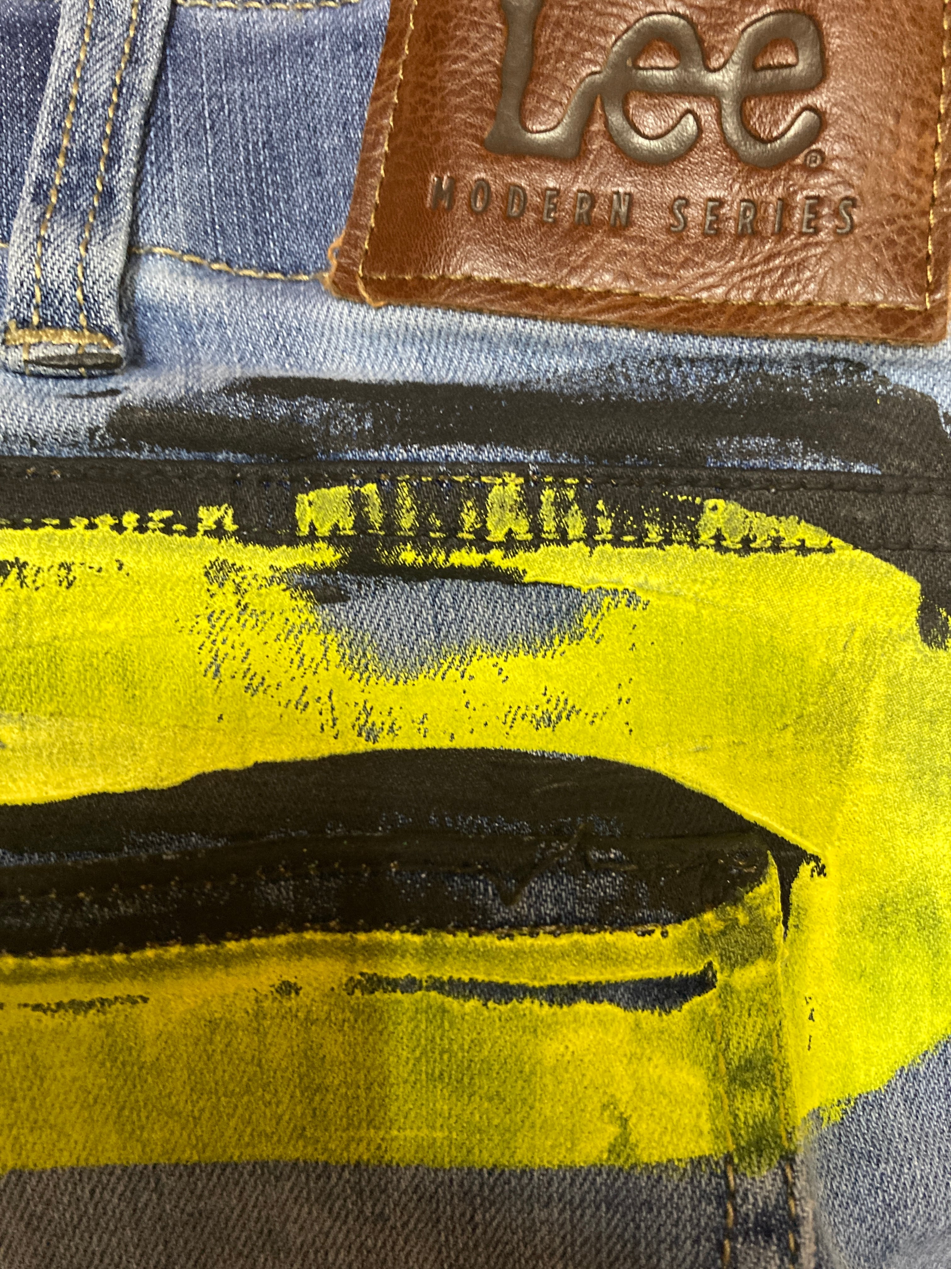 蛍光イエローNYOROシルクスクリーンプリントがインパクト大のビッグサイズデニムパンツ