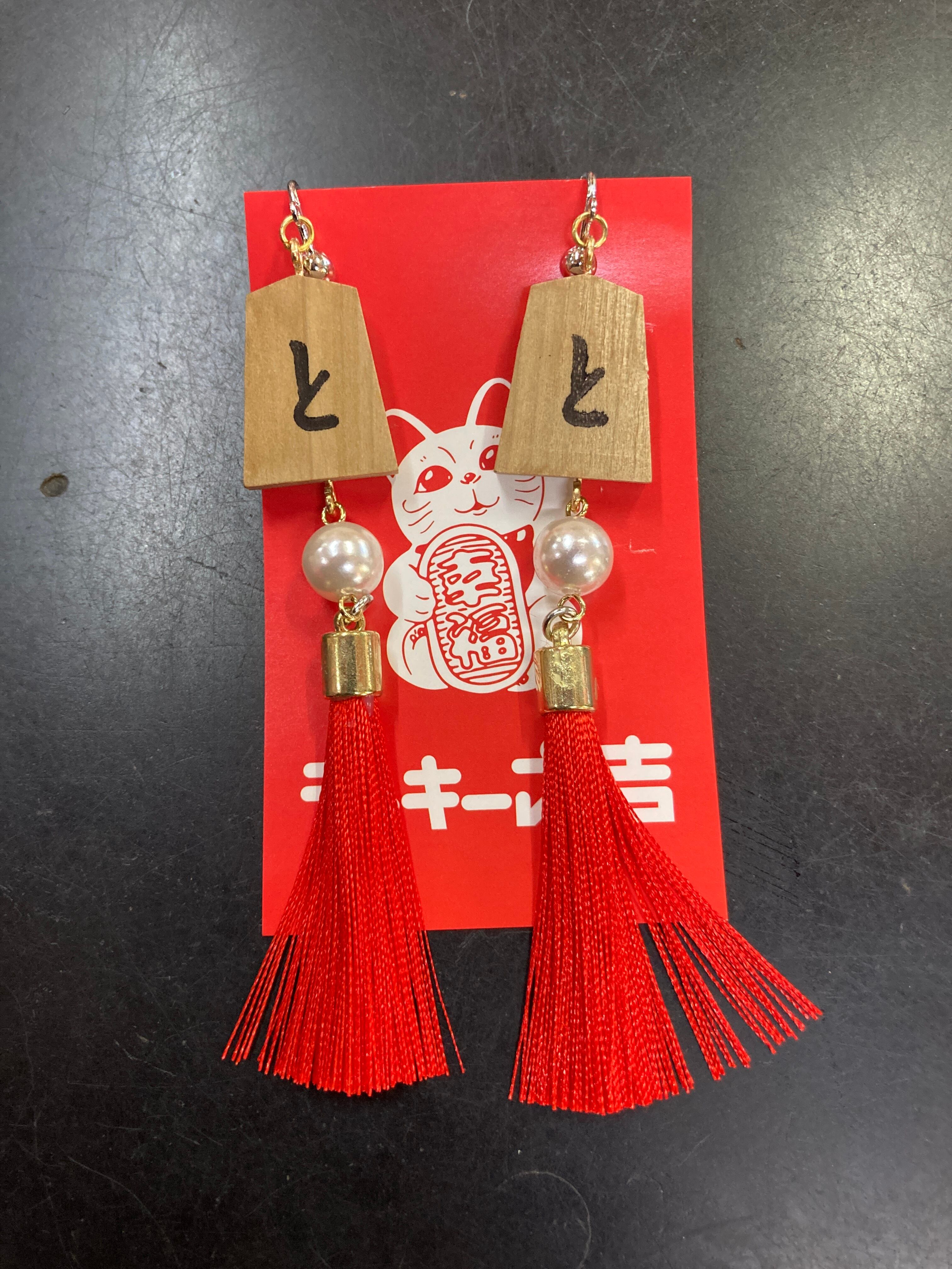 将棋駒とめでたい赤タッセル可愛いイヤリング